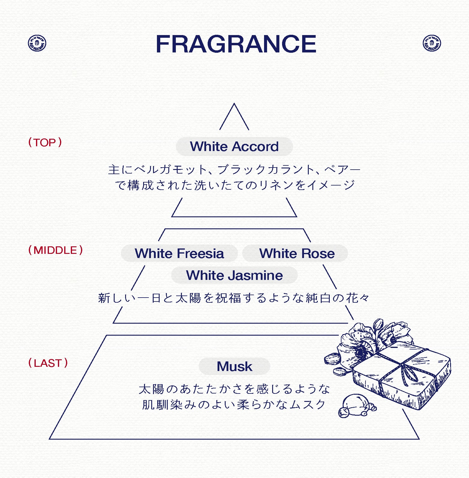 ラストはムスクが柔らかにたゆたい、陽射しの温もりが残るリネンのように素肌と心をそっとくるみます。