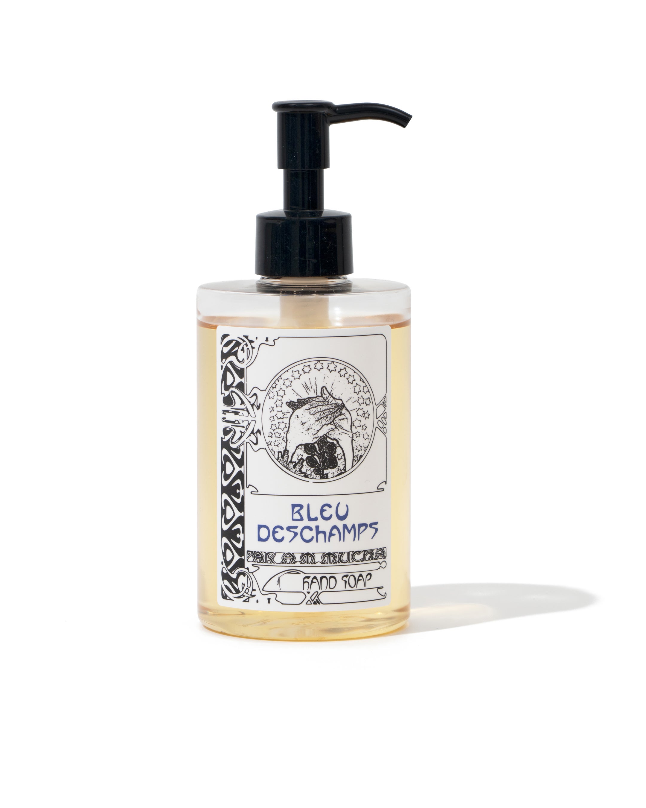 洗うたびに気分もリフレッシュできるハンドソープは、高級感を意識したとろみのあるテクスチャーで天然色素で着色。アミノ酸系洗浄成分のマイルドな使用感で泡立ちも穏やか。泡立てるとすぐに、オードトワレと同じ香りが広がります。泡切れも良く、素早く洗い流せるのに洗い上がりはしっとりで、心地よい香りが手肌に程よく漂います。ラベルには、ルーム&ファブリックミスト同様、「装飾資料集」の表紙に登場する「トリポリの姫君イルゼ」の手のアートをコラージュしています。“優れた芸術は日常の中にあってほしい”というミュシャのフィロソフィーを体現したデザインです。