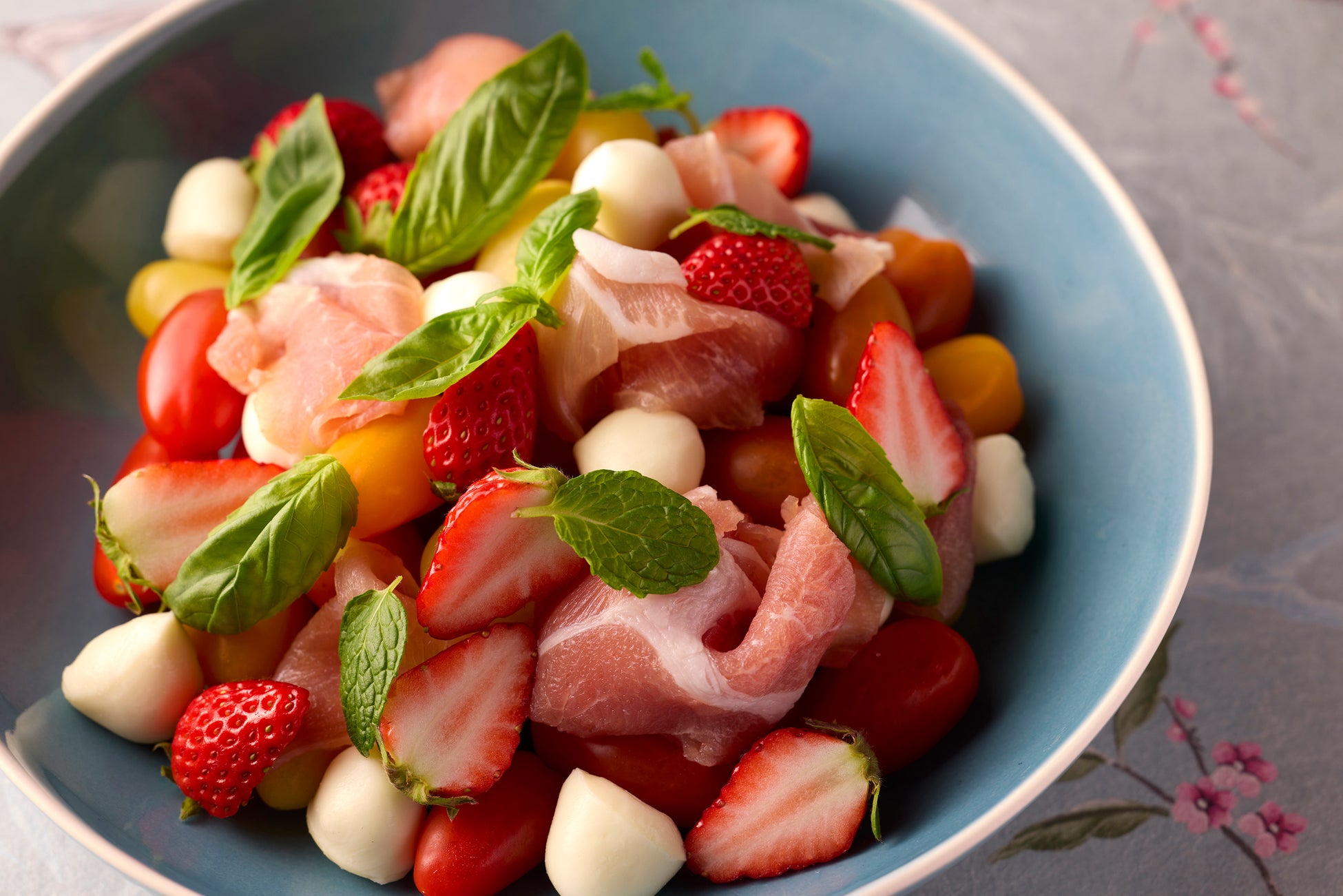 トマトとモッツァレラチーズと苺のカプレーゼ 生ハムを添えて