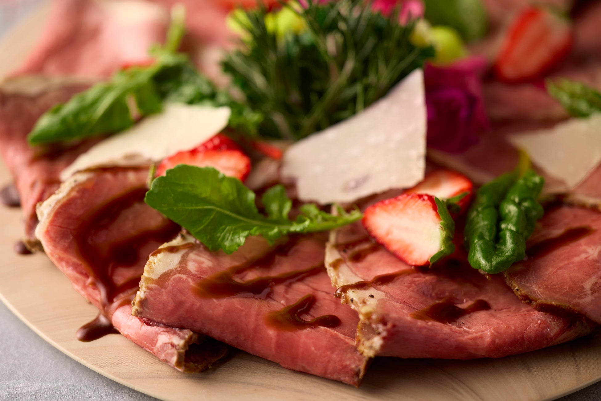 コールドローストビーフ 苺・ルッコラ・パルミジャーノ スモーキーなバルサミコソース