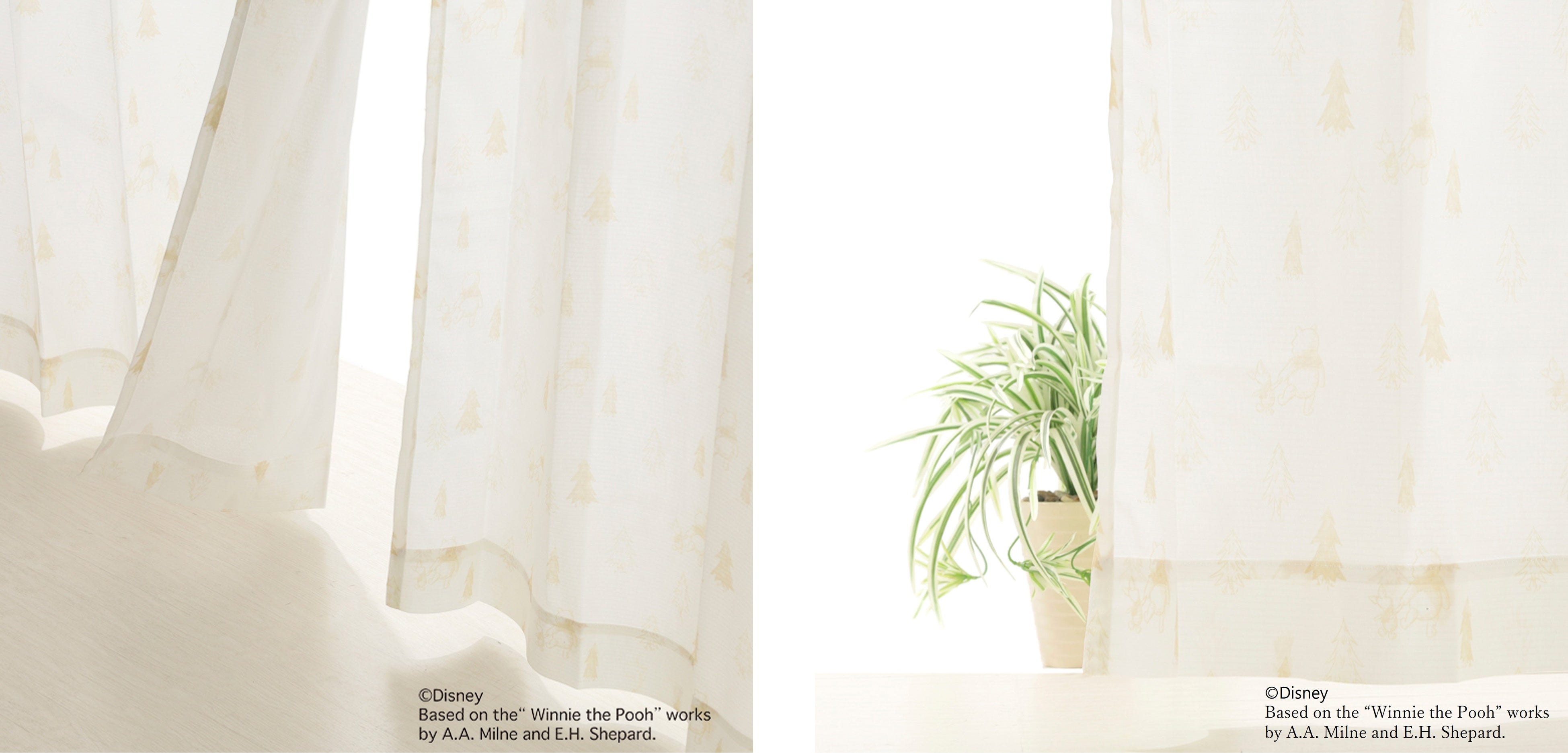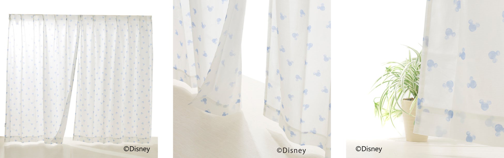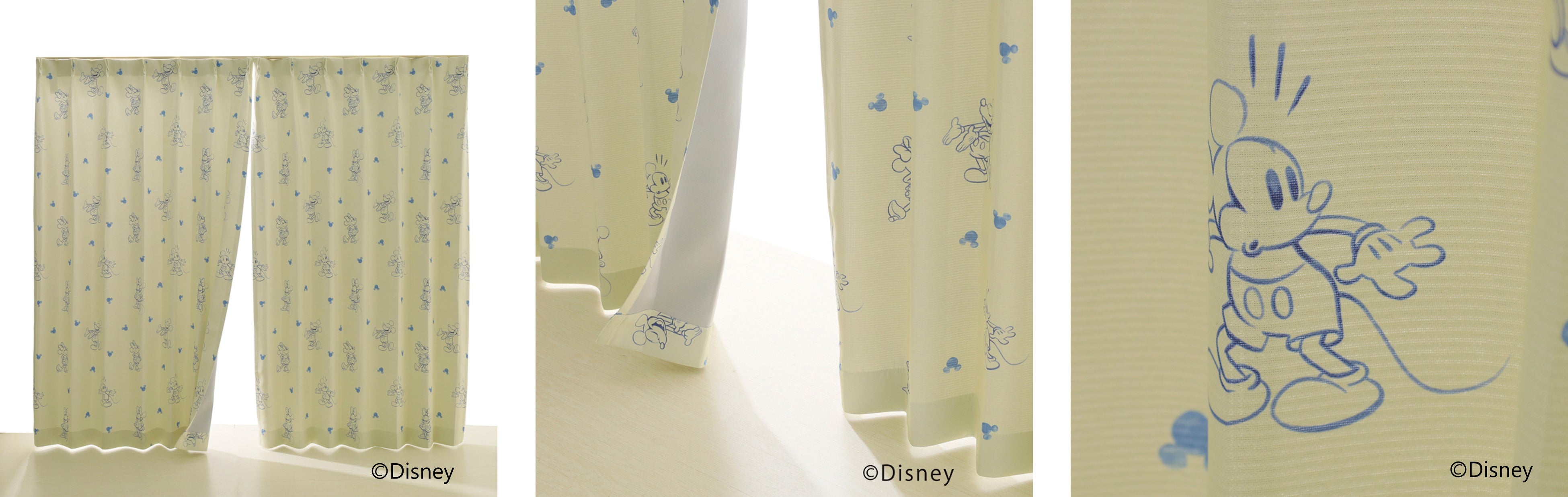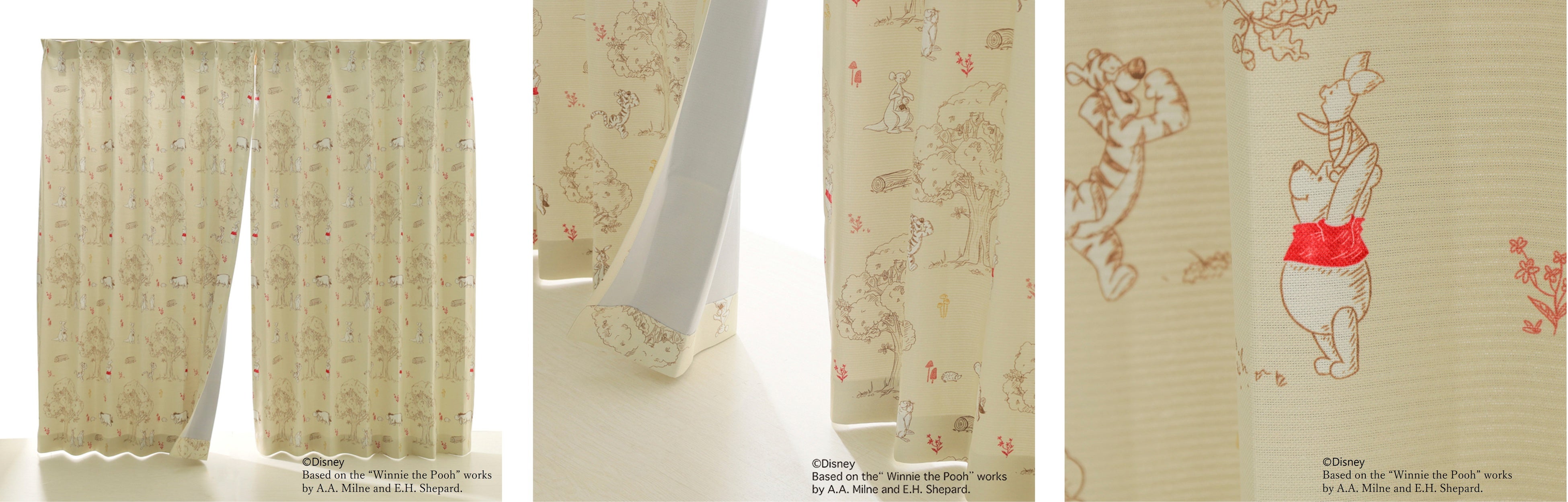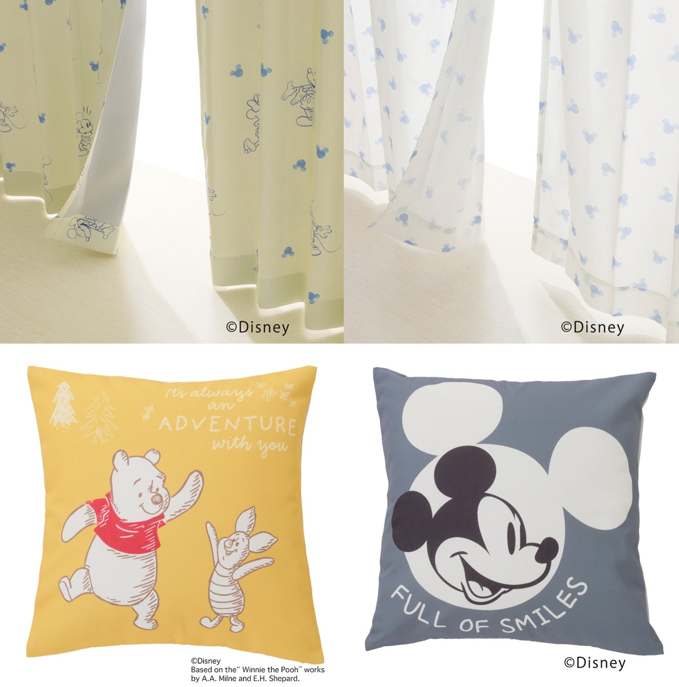 ミッキーマウスやミニーマウス、くまのプーさんのデザインの厚地カーテンやレースカーテン、クッションカバーが登場