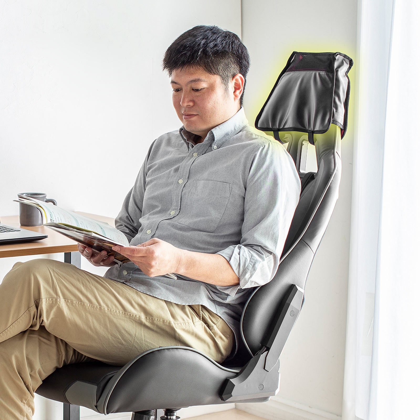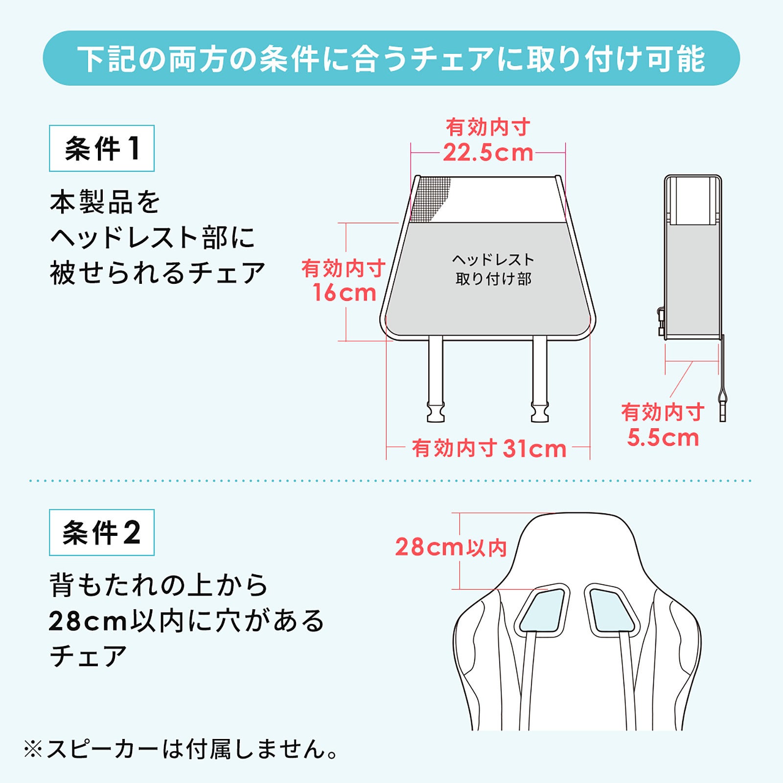本製品は、チェアのヘッドレストに取り付けて使用するスピーカーアタッチメントです。ヘッドレストにスピーカーを後付けすることで、臨場感が増します。