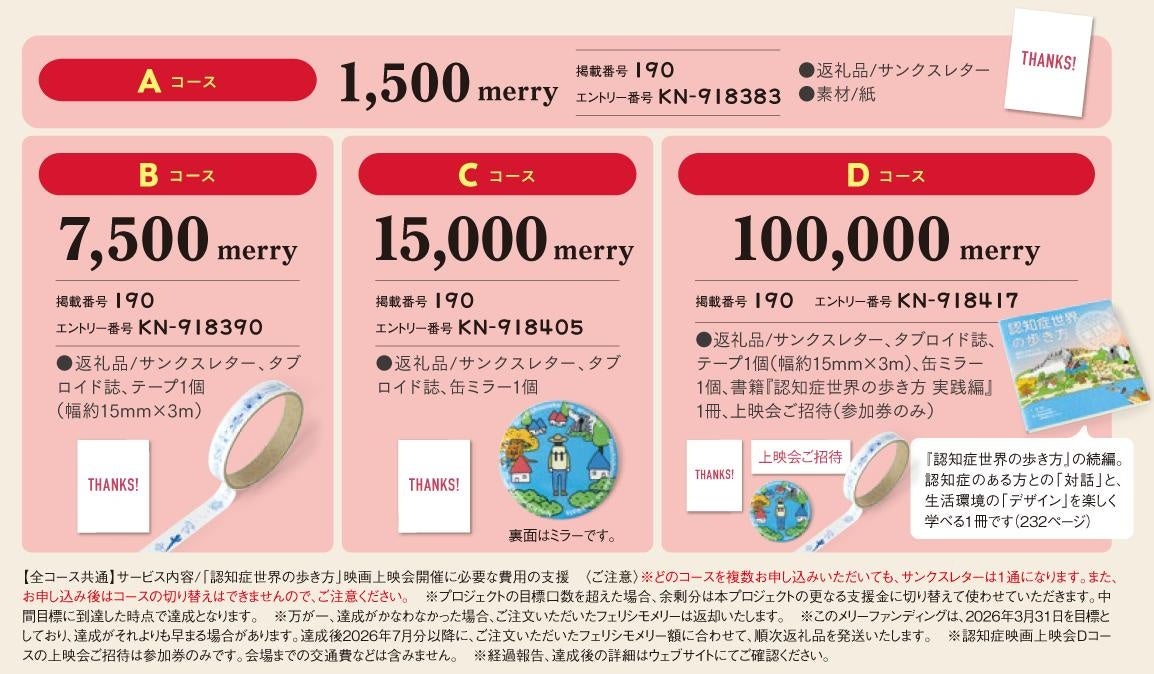 返礼品:サンクスレター、タブロイド誌、テープ1個(幅約15mm×3m)、缶ミラー1個、書籍『認知症世界の歩き方 実践編』1冊、上映会ご招待(参加券のみ)