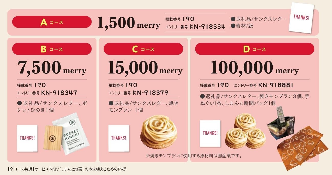 返礼品:サンクスレター、焼きモンブラン3個、手ぬぐい1枚、しまんと新聞バッグ1個