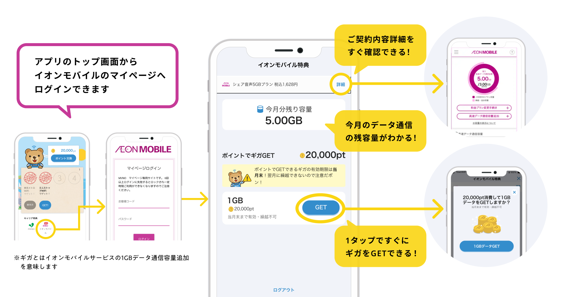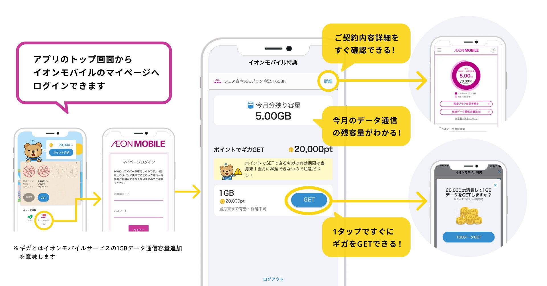 これにより、「イオンモバイル」のユーザーはタウンWiFiアプリを使えば使うほど、高速データ通信容量を節約できるだけでなく、お金をかけずに高速データ通信容量を増やすことができます。