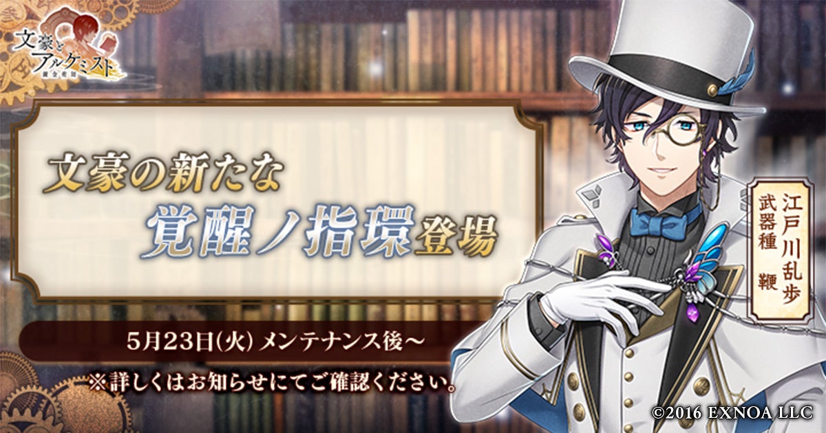 合同会社EXNOA(本社:東京都港区、CEO:村中 悠介、URL:https://games.dmm.com/)が運営するDMM GAMESは、5月23日(火)より、女性向け文豪転生シミュレーションゲーム「文豪とアルケミスト」において、江戸川乱歩の新たな「覚醒ノ指環」が登場いたしました。