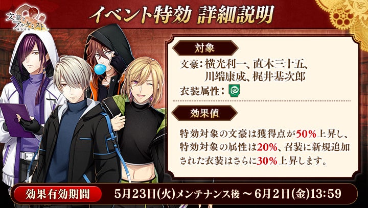 期間中「横光利一」「直木三十五」「梶井基次郎」「川端康成」の衣装を編成して潜書すると、得点の獲得数がそれぞれ50%上昇します。また、「風」属性の衣装を編成して潜書すると、得点の獲得数がそれぞれ20%上昇します。