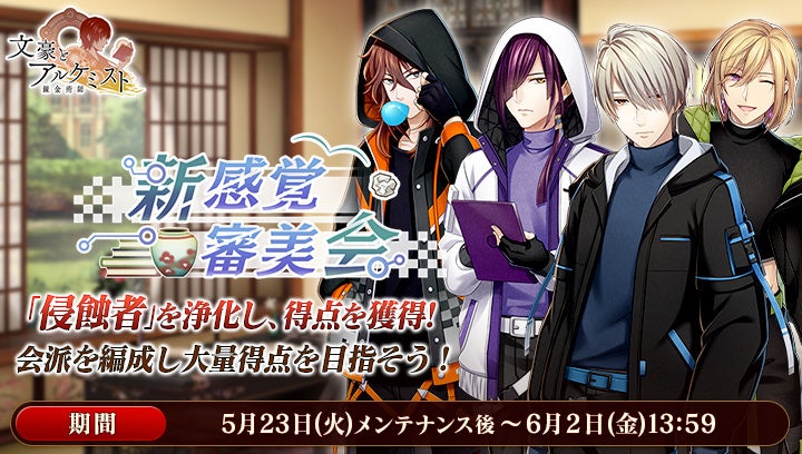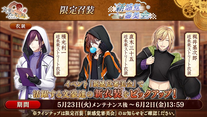 さらに、イベントと同時に開催される限定召装『新感覚審美会』にて新規追加された「横光利一」「直木三十五」「梶井基次郎」の〈近未来ストリート衣装〉を編成すると、得点の獲得率がそれぞれ30%上昇します。