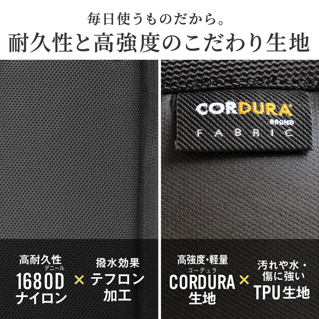 外装は1680デニールの糸を使用した丈夫なナイロン生地とコーデュラ生地を組み合わせています。生地表面汚れや水を弾くコーティングを施しているため雨の日でも安心して使えます。