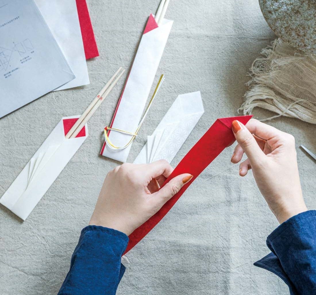 〈A4和紙セットと折形指南書〉は、指南書から、A4和紙を箸袋や金封に仕立てることもできます。