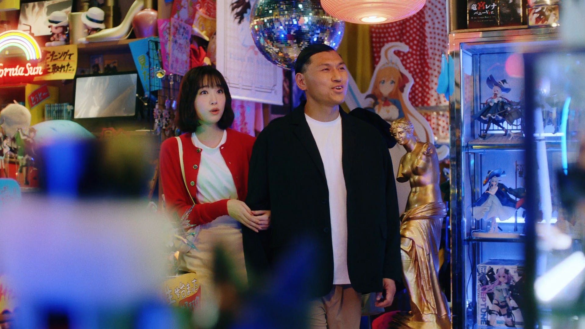 そこは漫画やアニメグッズ、TVモニターなどが所狭しと置いてあるショップ。春日さんと髙橋さんカップルが店内を見渡し、商品量の多さに「うわ…すごいねこの量…。」「ホント…。」と感心する二人。そこに店員役の雨宮さんが「DMM TVはアニメ・エンタメ見放題です!」と声をかけると、思わず雨宮さんが掲げたスマホの画面を見つめてしまう春日さん。そこには「DMM TV」のインターフェイスが。気を惹かれた春日さんを見かね、髙橋さんがすかさず「それって、私を見る時間減らない?」とかわいく問いかけると、「減らない。」と髙橋さんを見つめながら優しい声を掛ける春日さん。「ズルいよ」と照れる髙橋さんを見て、「ナニコレ・・・」と呆れ気味にツッコむ雨宮さん。