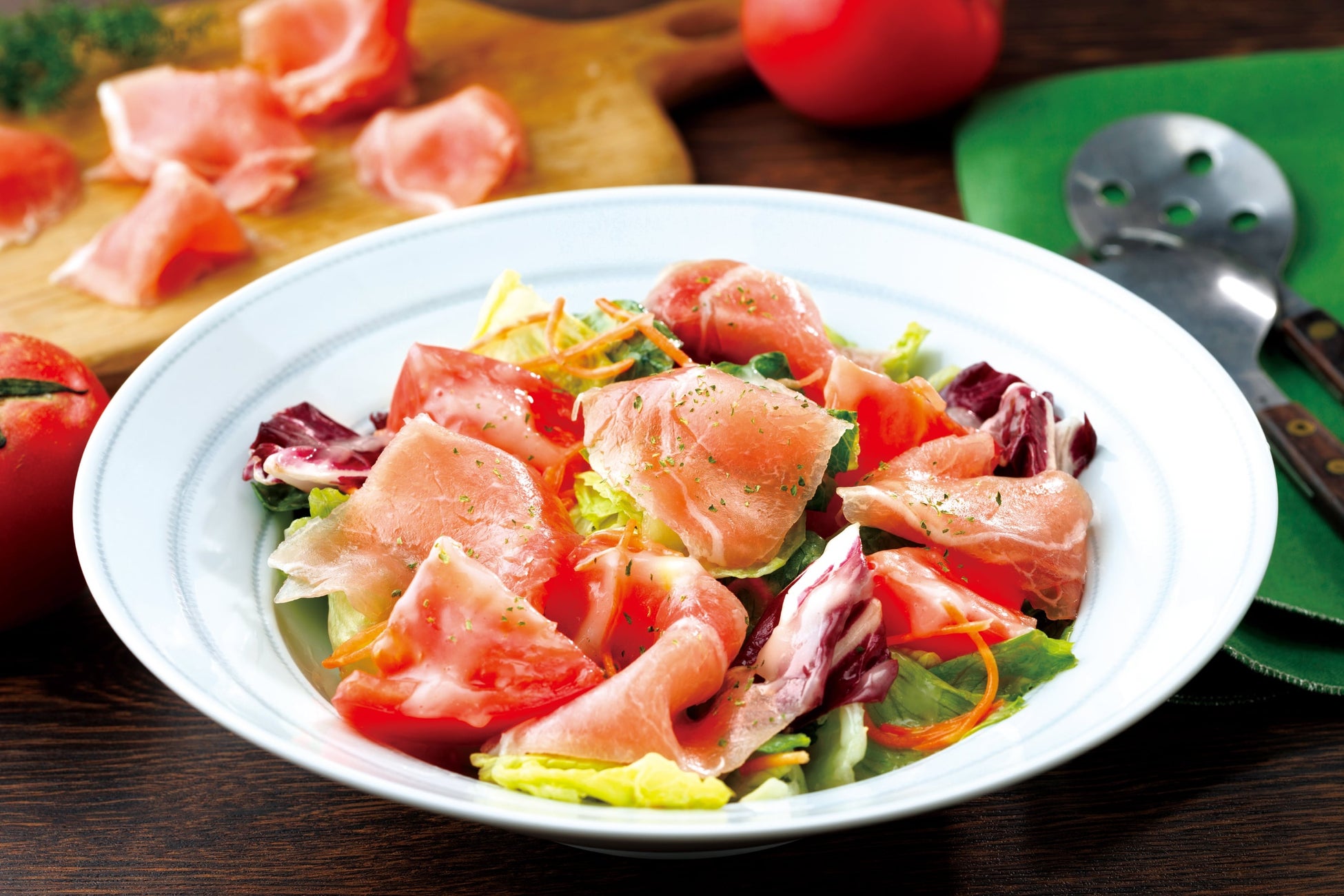 色鮮やかなトマト、レタス、ロメインレタス、トレビス、人参に、しっとりとした生ハムがトッピングされたサラダです。