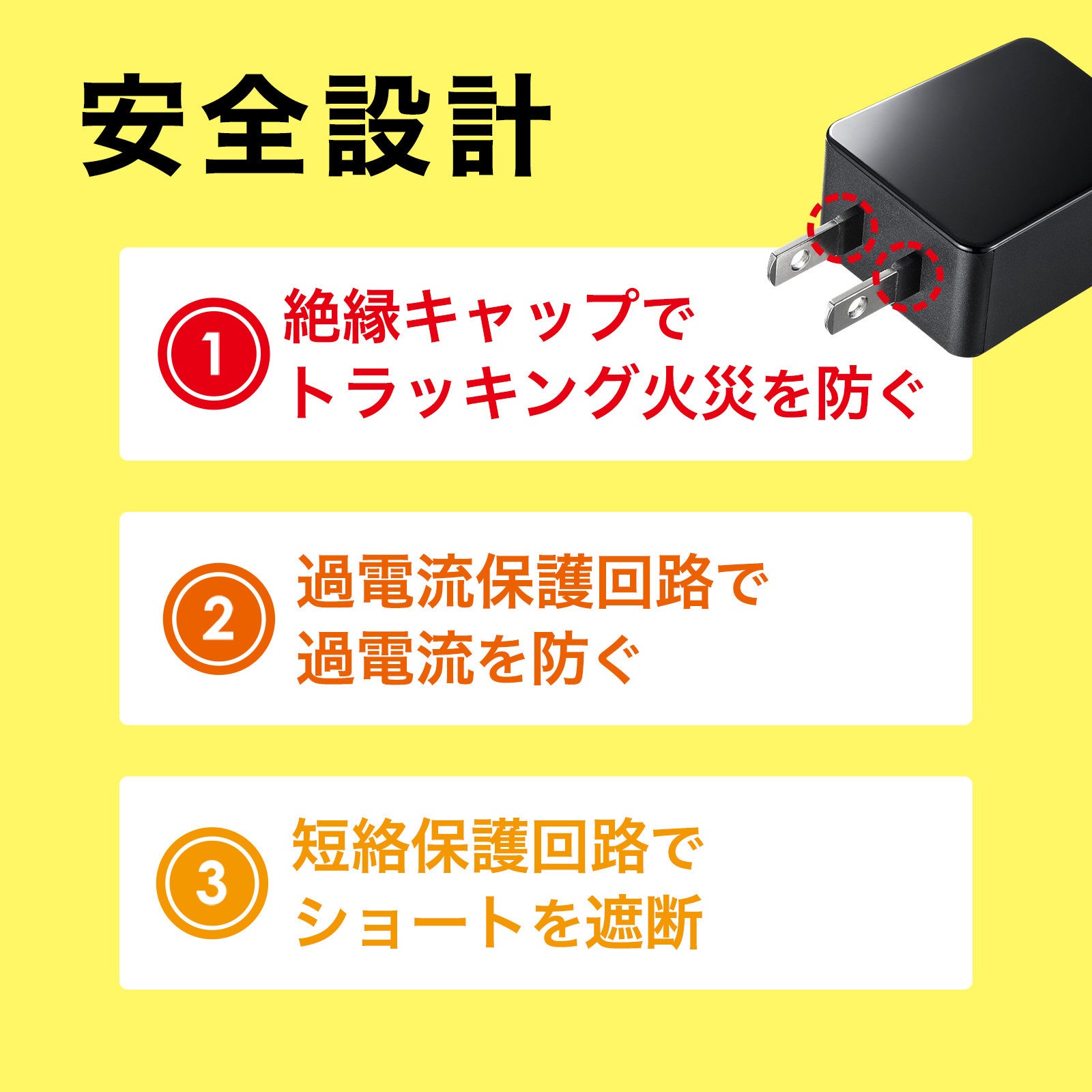プラグ部分にはトラッキング現象による火災を防ぐ絶縁キャップを採用し、ケースには難燃性樹脂(UL94規格V-0相当)を採用しています。さらにショートや過電流による電気火災を防ぐ過電流保護回路、短絡保護回路を採用した安全設計になっています。