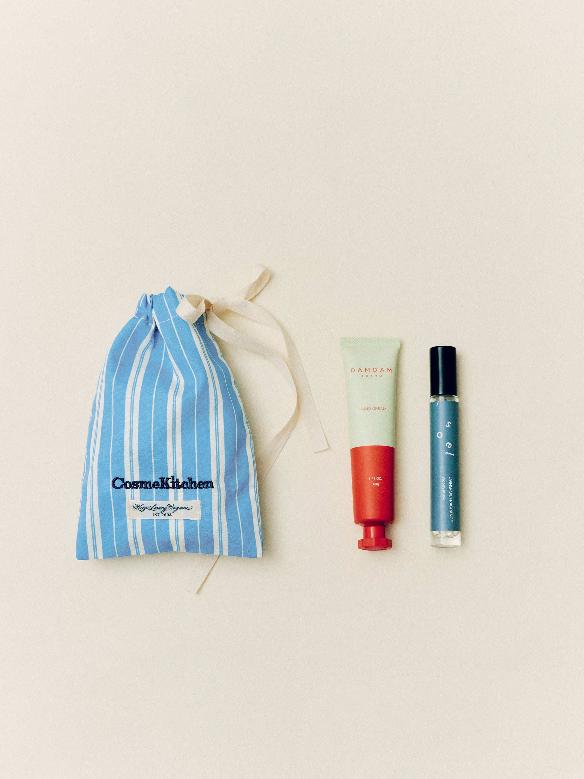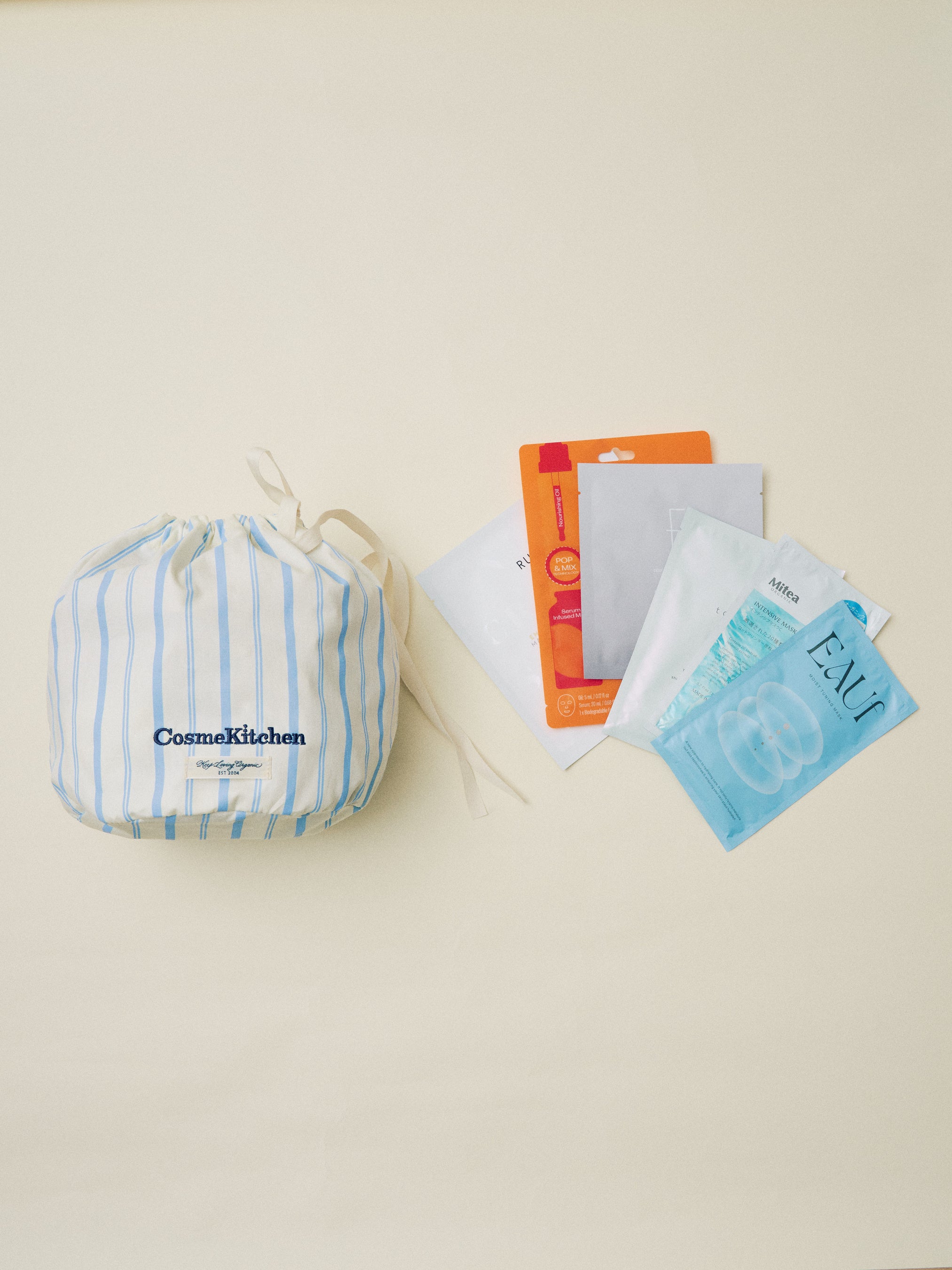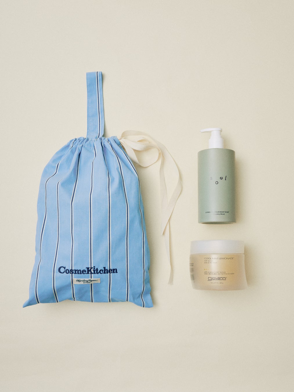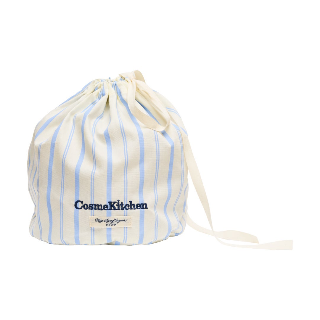 巾着には、スタンダードで長く愛されているストライプ柄を採用。ブルートーンのCosme Kitchenオリジナル“コスキチストライプ”をあしらい、自分用としてはもちろん、贈り物を大切に包みながら、もらった後も使い続けられるような、日常の溶け込むデザインに仕上げました。