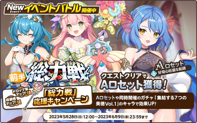 開催中の総力戦イベントで編成すると、アイテムドロップ率とキャラクターの獲得経験値がUPします。