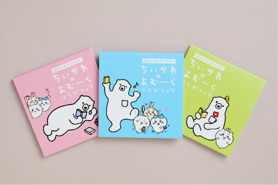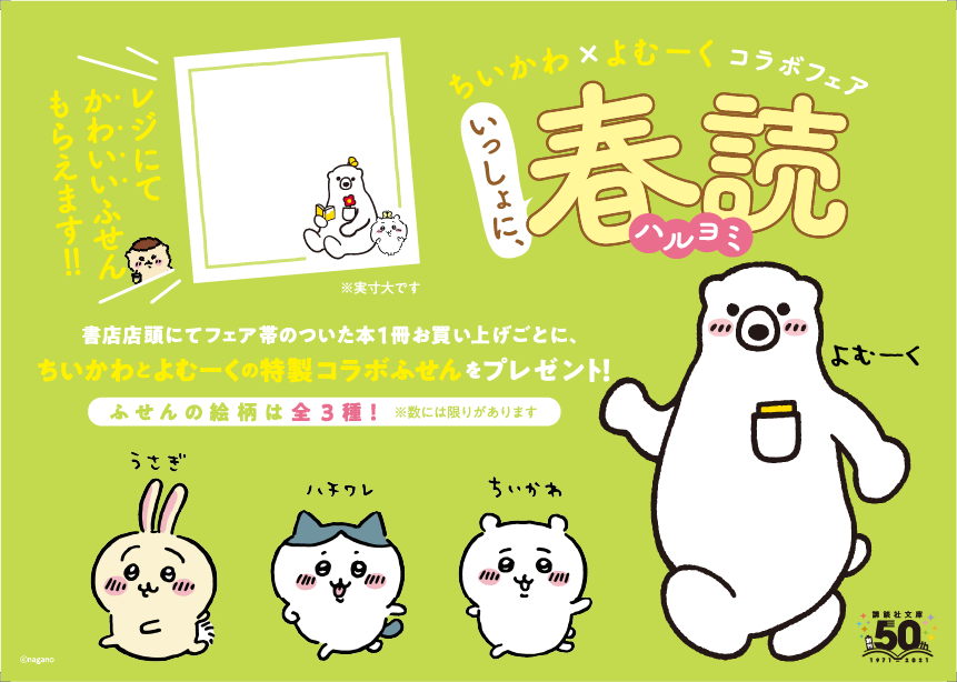 講談社文庫の創刊50周年を機に誕生したオリジナルキャラクター、シロクマ「よむーく」と、TVアニメも放送開始されますます盛り上がりを見せている大人気漫画『ちいかわ』がコラボ!