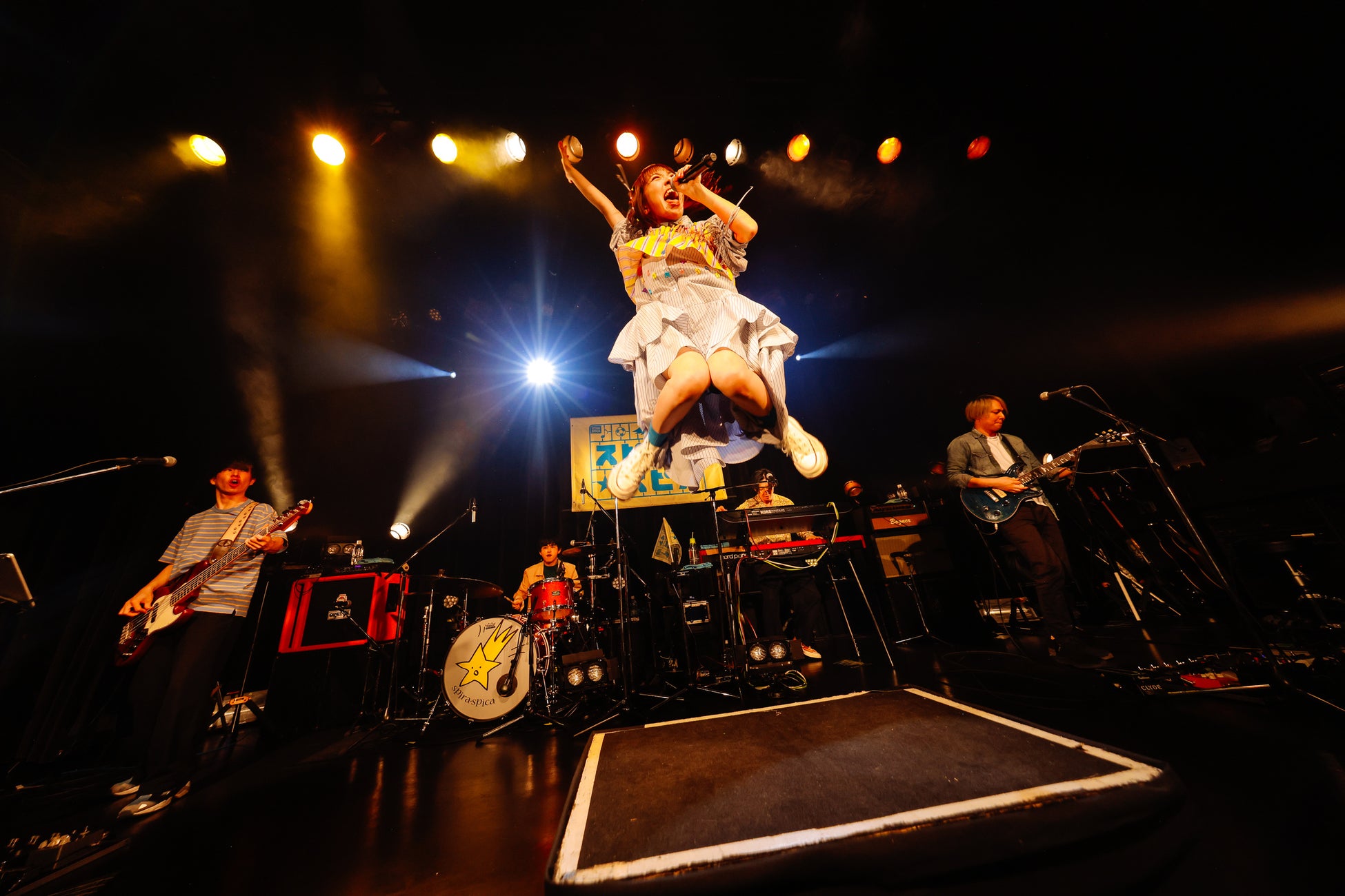 文字数の密度が高く自由すぎるMCが特徴的なスピラ・スピカとしては珍しく、ここまでMCなしノンストップで歌ってきた幹葉は、「いつ喋りだすんやと思った⁉」と問いかけ、会場は笑いに包まれた。ライブも終盤に差し掛かり、静岡のプロ・サッカークラブ、ジュビロ磐2024シーズンソング「FIRE SPIRIT」を皮切りに、「サークルフィッシュ」「君なんか好きにならない」(Webマンガ『今度は殺されたくないアザラシさん』テーマソング)、「恋はミラクル」(TVアニメ『みだらな青ちゃんは勉強ができない』エンディングテーマ)と、ライブ人気曲を次々に披露。「フィーリング タイミング ハプニング」というコーラスと共に、お寿司を握る手の形で盛り上げるクラップの光る「サークルフィッシュ」では、サポートメンバーたちも魚のようにステージを動き回るパワフルなパフォーマンスと共に、観客は力強いクラップを響かせた。