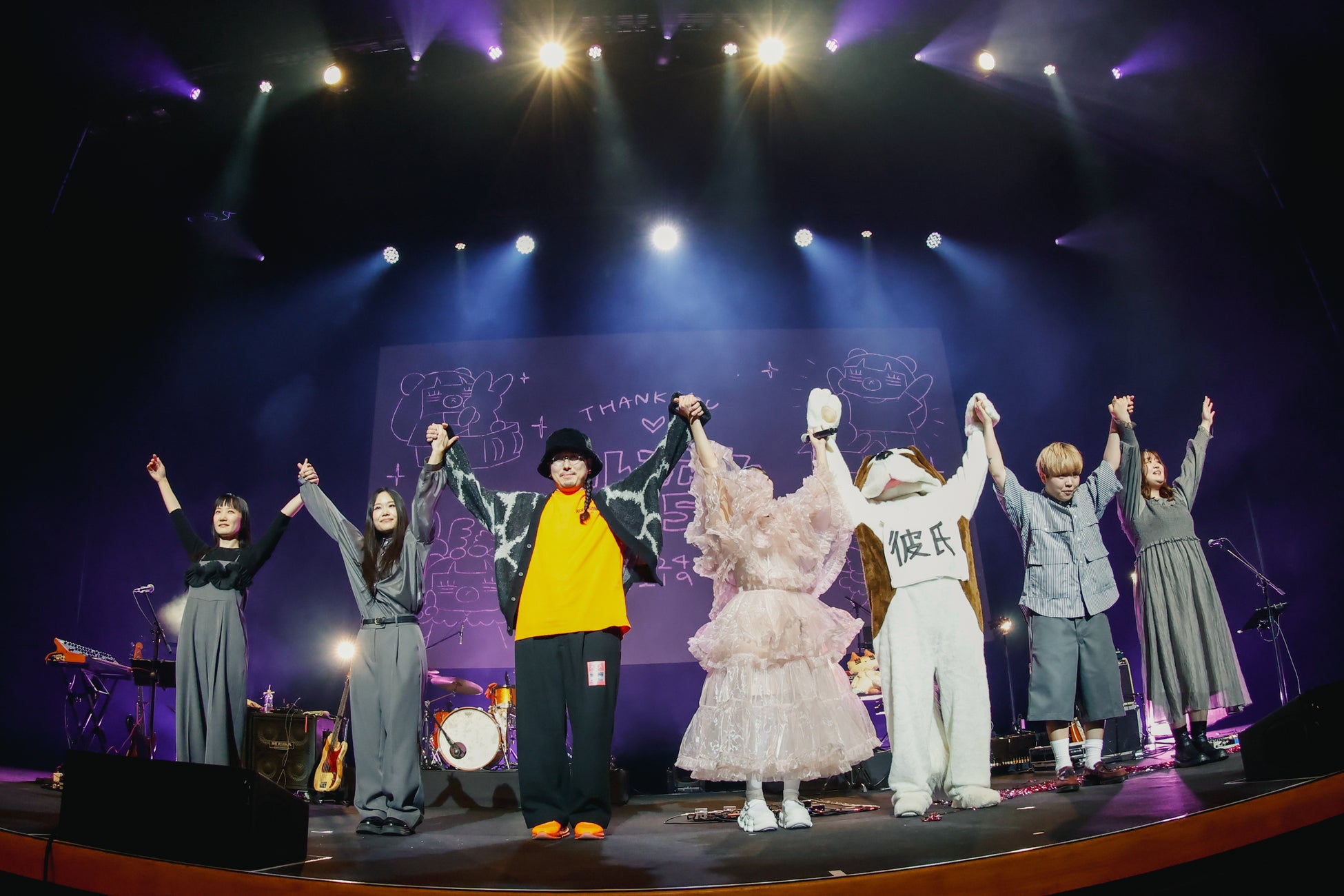 れ子ちゃんが旅の最初に見つけたのは“らぶ”。ここから「あたしが死んでも」など愛について描いた楽曲を披露していく。「みんな、こんばんはー! 今日は、私についてくる準備できてる? 一緒に旅をしましょう。レッツゴー!」という一言から、ライブ定番曲「あたしを彼女にしたいなら」へ。ひぐちけい(Gt)のキレのあるギタープレイが盛り上げる中、コレサワが観客を煽り、クラップや合いの手で会場の一体感を高めていく。SNSで流行中の「元彼女のみなさまへ」では、スクリーンにカラオケ風の歌詞つき映像が流れ、大合唱が起こった。
