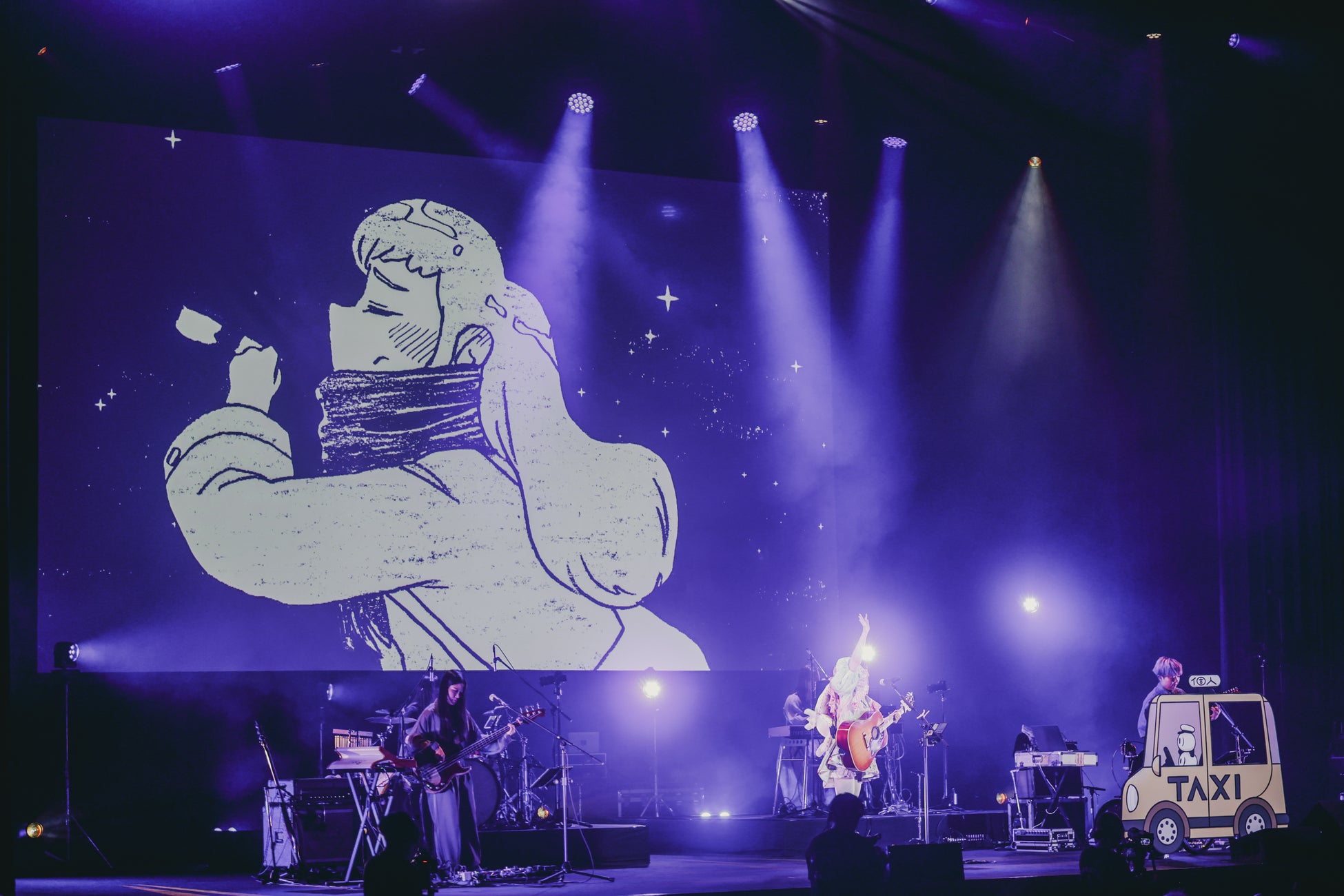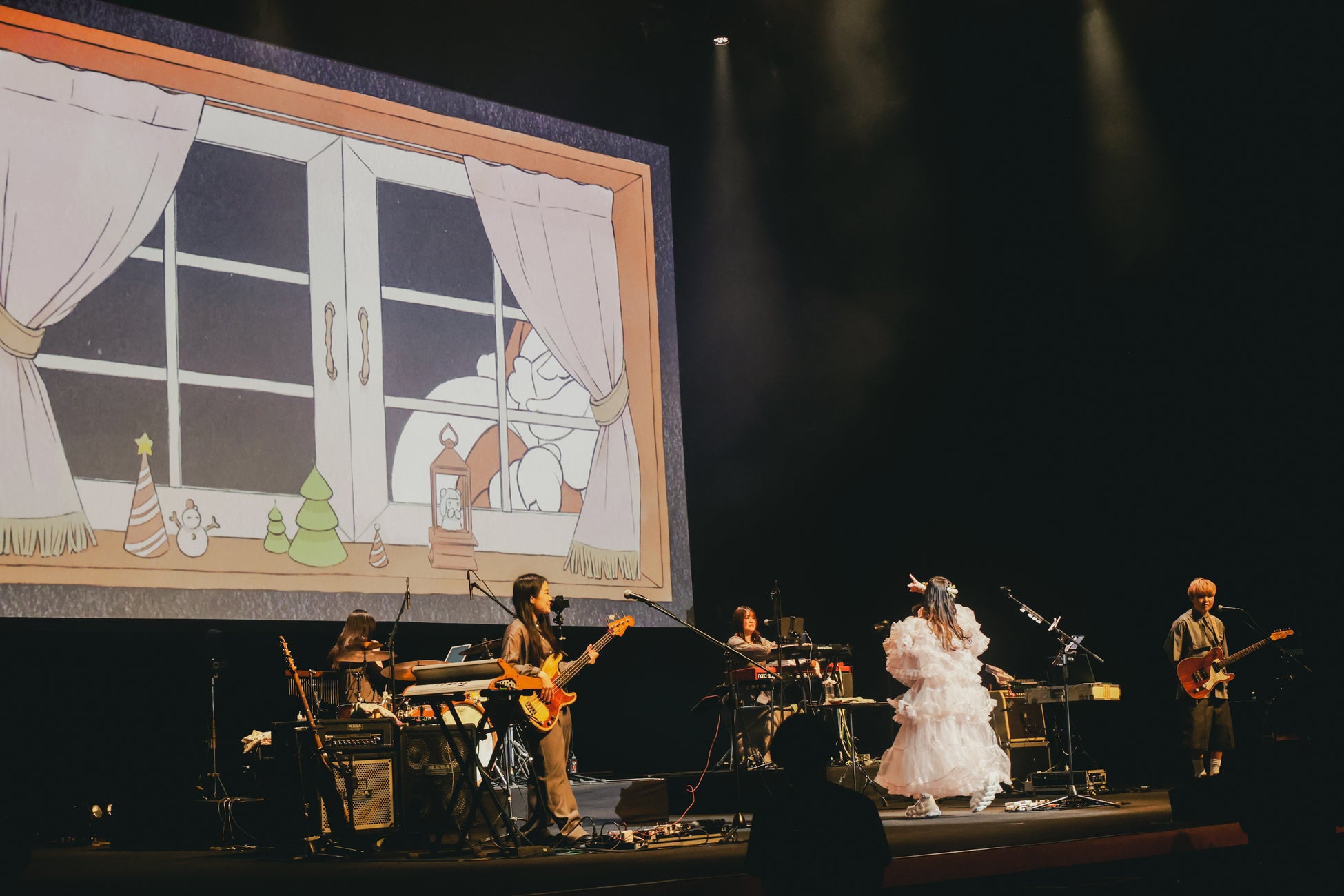 心の“もやもや”かられ子を守りボロボロになったうさぎを抱いて、れ子ちゃんは「あたしがずっとそばにいるよ」と泣きながら語りかける。その優しさに触れたうさぎには羽根が生え、「ぼくはいかなきゃ またね」と飛び立っていった。そして、月に向かっていくうさぎの映像を背景に「Moon」を披露。シンセドラムやシンセベースを活かした雄大なサウンドに乗せ、コレサワは優しく繊細に歌を届けた。物語がクライマックスを迎えたところで、この季節限定でお披露目する「お願いサンタクロース」に。窓枠のイラストが映し出され、その外には雪がちらついている。下山明恵(Key)のキーボードの音色が荘厳に響く中、客席はペンライトで赤と緑のクリスマスカラーに染まった。