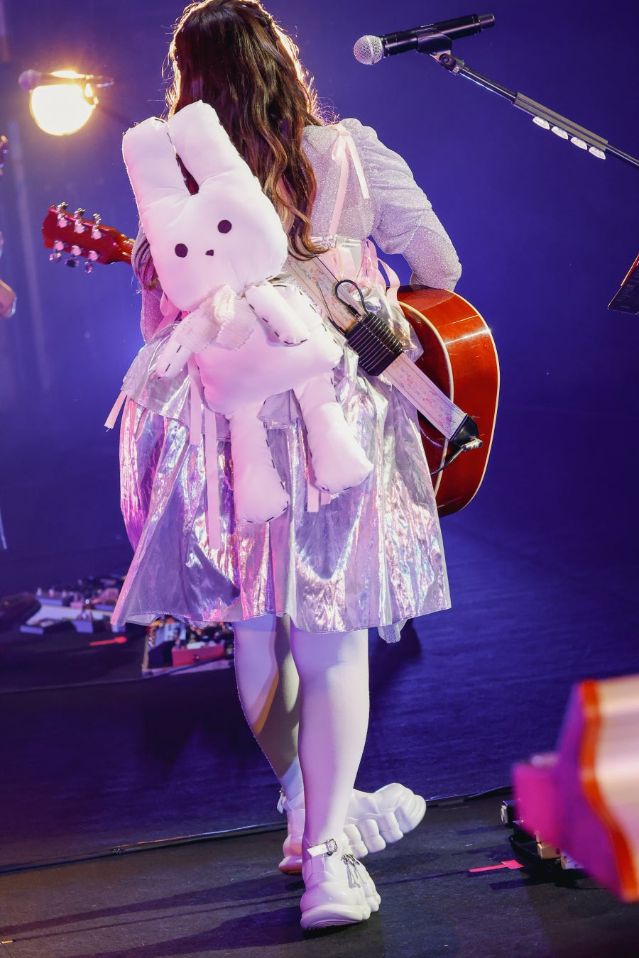 今回は、コレサワのキャラクター“れ子ちゃん”の秘密に迫るストーリー。定刻になるとブザーが鳴り、映画さながらに開演前の注意事項が流れる。そして、アートワークを手掛けるウチボリシンペが描き下ろしたアニメーションを上映。れ子ちゃんの体にはぽっかり穴が空いており、周囲から「変なの」「気持ち悪い」など心ない言葉を投げかけられてしまう。傷ついたれ子ちゃんは、穴を埋める方法を探す旅に出る――「君も一緒に来る?」というナレーションから、「シュシュ」でライブがスタート。コレサワはれ子ちゃんと同じうさぎのぬいぐるみを背負い、U(Dr)のドラムに合わせて足踏みをする。そんなコレサワとれ子ちゃんの姿、旅について描いた「シュシュ」の歌詞がリンクし、高揚感と切なさをかき立てる。