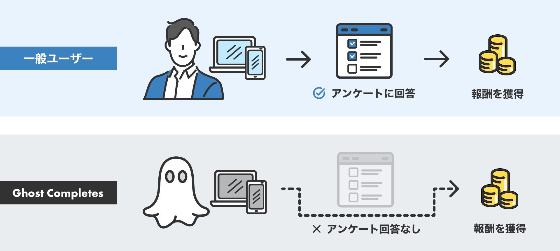 「Ghost Completes」は、インターネットリサーチにおいて、ハッキングにより、アンケートに実際には回答していないにも関わらず、回答が完了したかのように偽装する不正行為です。一般的なインターネットリサーチでは、アンケートに回答したユーザーにポイント等の報酬が付与される仕組みが採用されているため、「Ghost Completes」の攻撃者は、システム上で回答の完了を装うことで、報酬の不正取得を狙っています。