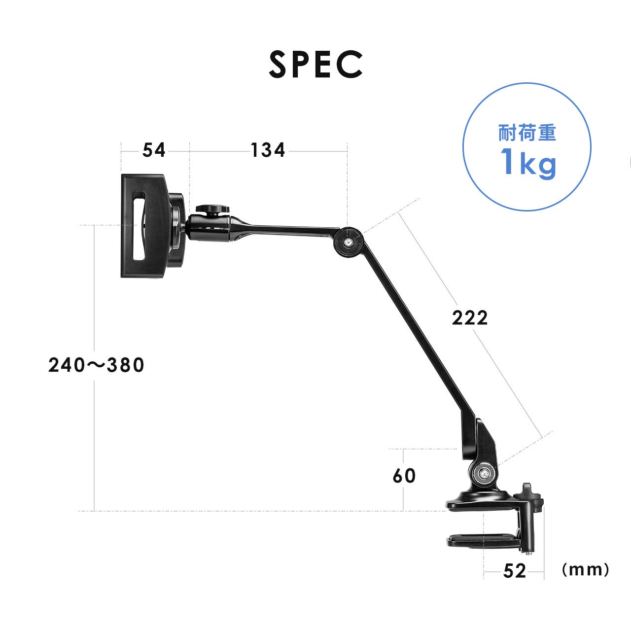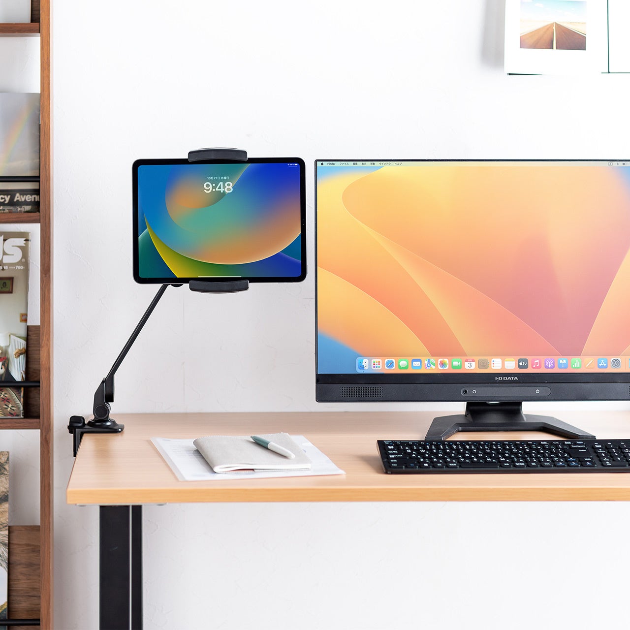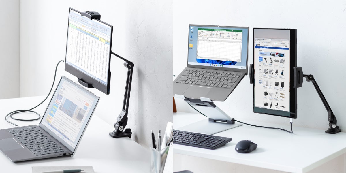 クランプ式で机の天板やラックの棚などに固定ができて6関節と無段階アームで高さや角度の調整可能なモバイルモニタースタンドを5月9日に発売