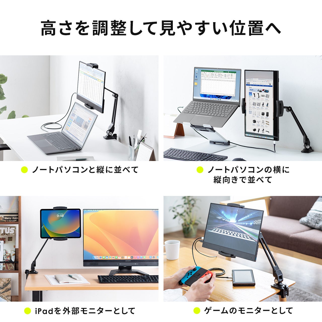 高さ調節ができる伸縮アームにより、目線の位置やノートパソコンの画面上など様々な位置にモバイルモニターをセットできます。