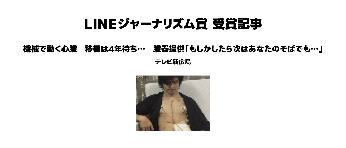 今年も、元TBS報道キャスターで⽩鴎⼤学特任教授の下村健⼀⽒、東京工業大学リベラルアーツ研究教育院准教授の治部れんげ氏、ウェブメディア「DANRO」編集長で関西大学総合情報学部特任教授の亀松太郎氏、NPO法人自殺対策支援センターライフリンク代表の清水康之氏に加えて、キャスターでありジャーナリストの長野智子氏、一般社団法人SDGs in SPORTS代表理事の井本直歩子氏を特別アドバイザーに迎えた「LINEジャーナリズム賞」は、テレビ新広島報道部・石井百恵氏の『機械で動く心臓 移植は4年待ち… 臓器提供「もしかしたら次はあなたのそばでも…」』が受賞いたしました。