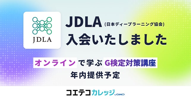 また、GMOメディアはこの度の入会をきっかけに、JDLAが実施するAI・ディープラーニングの活用リテラシー習得のための『G検定(ジェネラリスト検定)対策講座』を開発し、オンライン講座プラットフォーム「コエテコカレッジ byGMO」において年内に提供予定です。