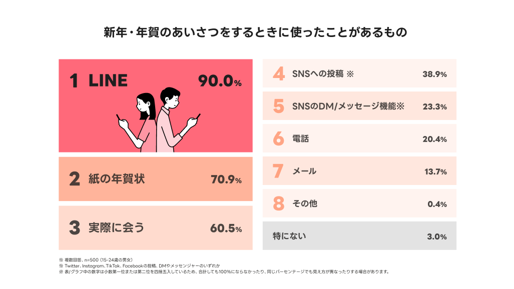- 新年の挨拶で「LINE」を使ったことがあるZ世代は90%!来年、「LINE」で新年の挨拶をする予定の人も80%以上で、“あけおめLINE”はZ世代のお正月の恒例に!また「SNSへの投稿」で新年の挨拶をする人は29.7%と、Z世代ならではの結果に