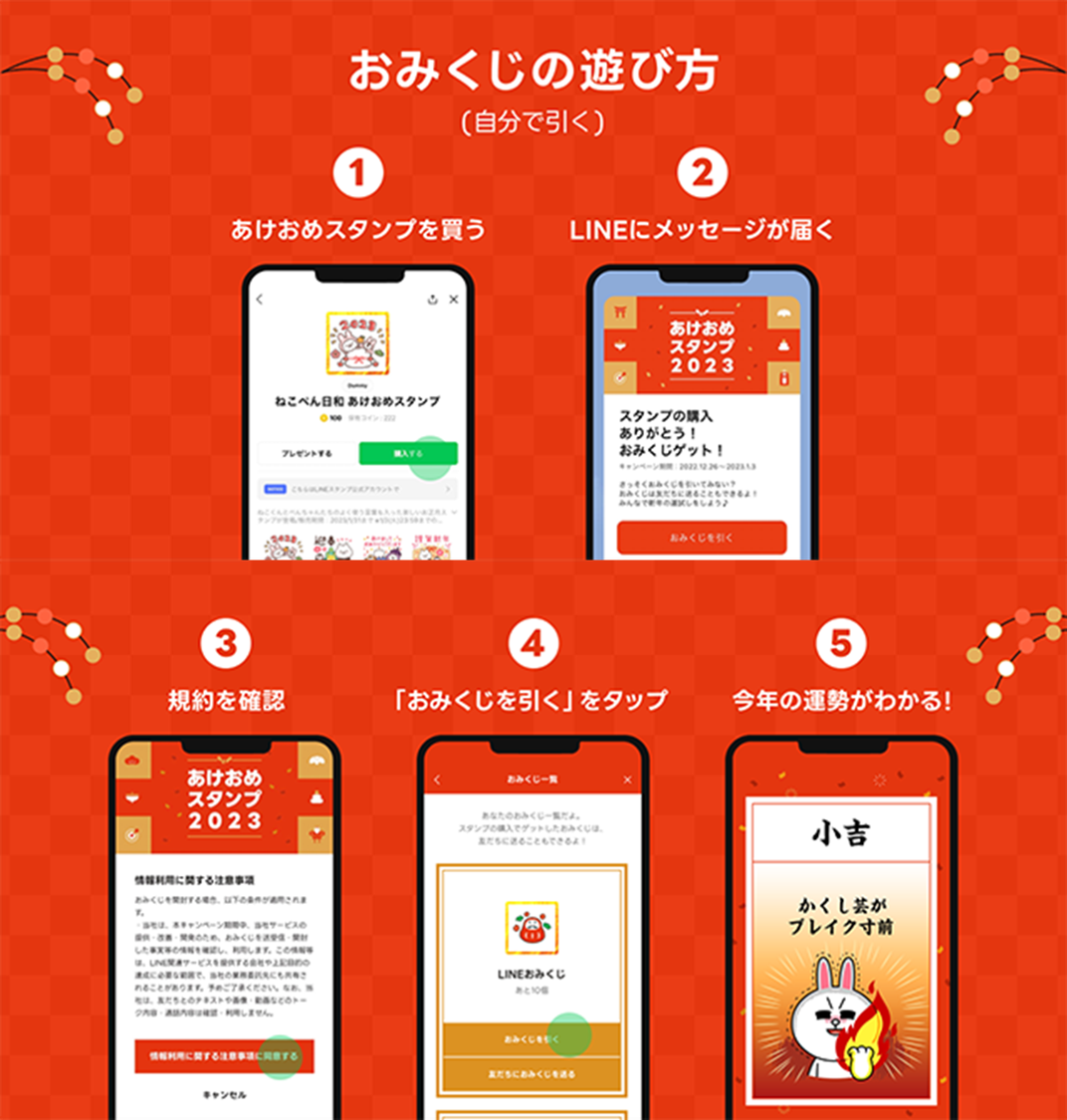 - 「あけおめスタンプ」を購入または友だちからもらって引ける「おみくじ」で運勢占い!