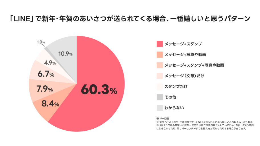さらに、同じく“あけおめLINE”が送られてきたらうれしいと感じると答えた人(n=486)に、『”あけおめLINE”で送られてきていちばんうれしいパターン』を聞いたところ(単一回答)、1位は「メッセージ+スタンプ」で60.3%と圧倒的な結果となりました。2位以降は「メッセージ+写真や動画」8.4%、「メッセージ+スタンプ+写真や動画」7.9%、「メッセージだけ」6.7%と続きました。スタンプとメッセージが両方送られてくるのが、いちばんうれしいと感じる方が多いことが分かります。