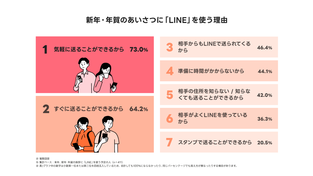 - 「LINE」を使う理由は、「気軽さ」「すぐに送れる」「準備に時間がかからない」が上位に。お正月の挨拶は、時間をかけず気軽に気持ちを伝えたいタイムパフォーマンスを意識する傾向も。