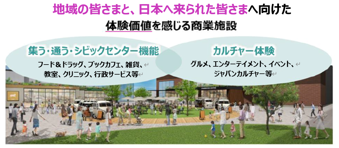 このたび「そよら成田ニュータウン」としての開業にともなう新たなコンセプトとして、「集う・通う・繋がる“成田の文化発信の拠点”」を掲げ、地域にお住まいの方に加え、訪日観光客の方も含めた地域交流の中心的な商業施設となることを目指します。