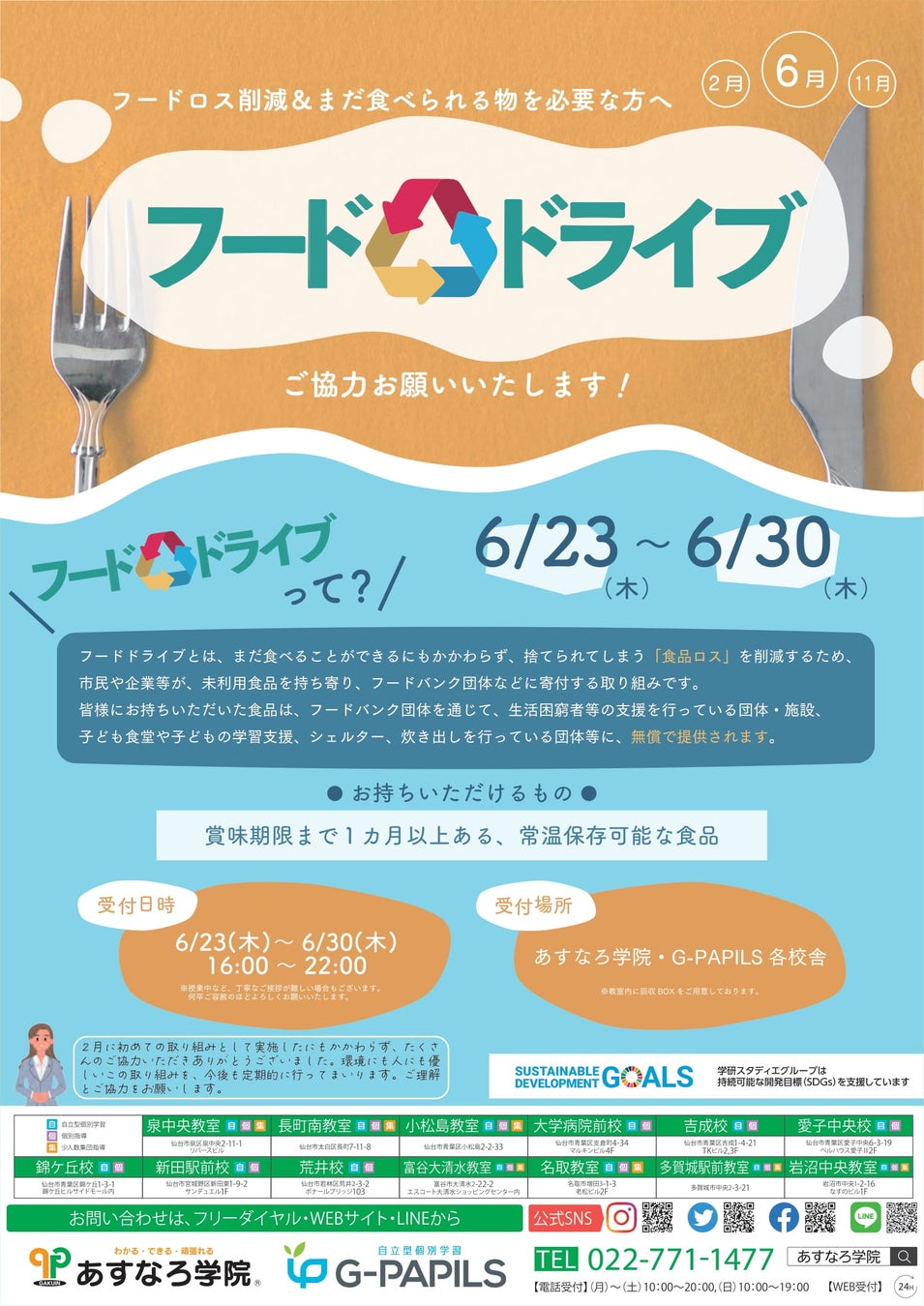 宮城県の総合進学塾あすなろ学院で第2回フードドライブ開催!