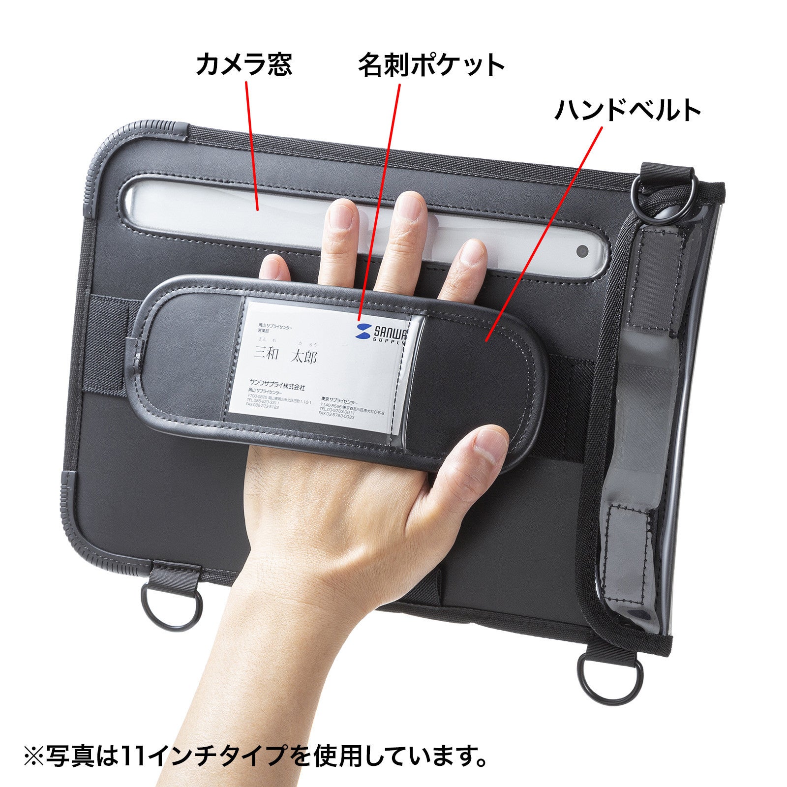 背面にはハンドベルトが付いているので、タブレットを安定して操作しやすくなります。ハンドベルトには名刺ポケットが付いており、名刺を入れておけば所有者が一目で分かり、機器の管理に役立ちます。