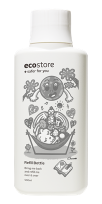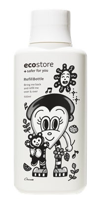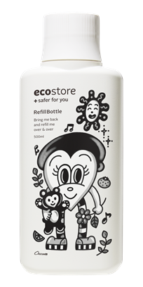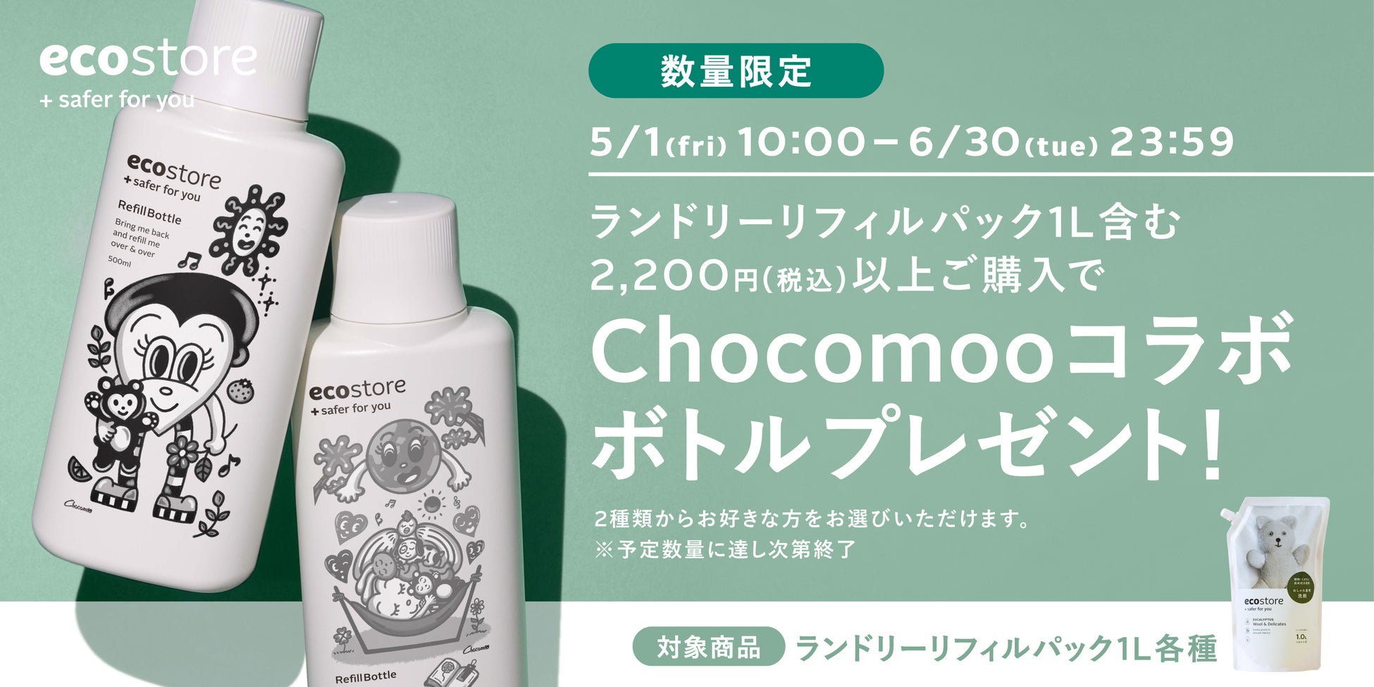 本シリーズは、エコストアが大切に守り続けているサステナブルな価値観を、さまざまなプロダクトを通じて表現する取り組みです。第1弾となる今回は “リフィル(詰め替え)文化”をテーマに、Chocomooによる描きおろしアートを使用した限定リフィルボトルラベルを制作。対象商品を一定条件以上ご購入いただいたお客様へ、ノベルティとしてプレゼントするキャンペーンを展開いたします。