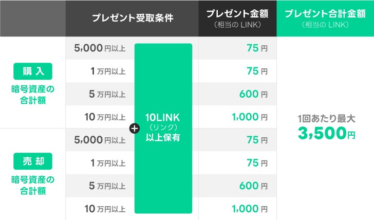 前回のキャンペーンでは、各暗号資産の売買金額に応じて毎日最大3,500円相当のLINK付与を20日連続で開催しましたが、ユーザーからのご好評をいただき早期にキャンペーンが終了しました。