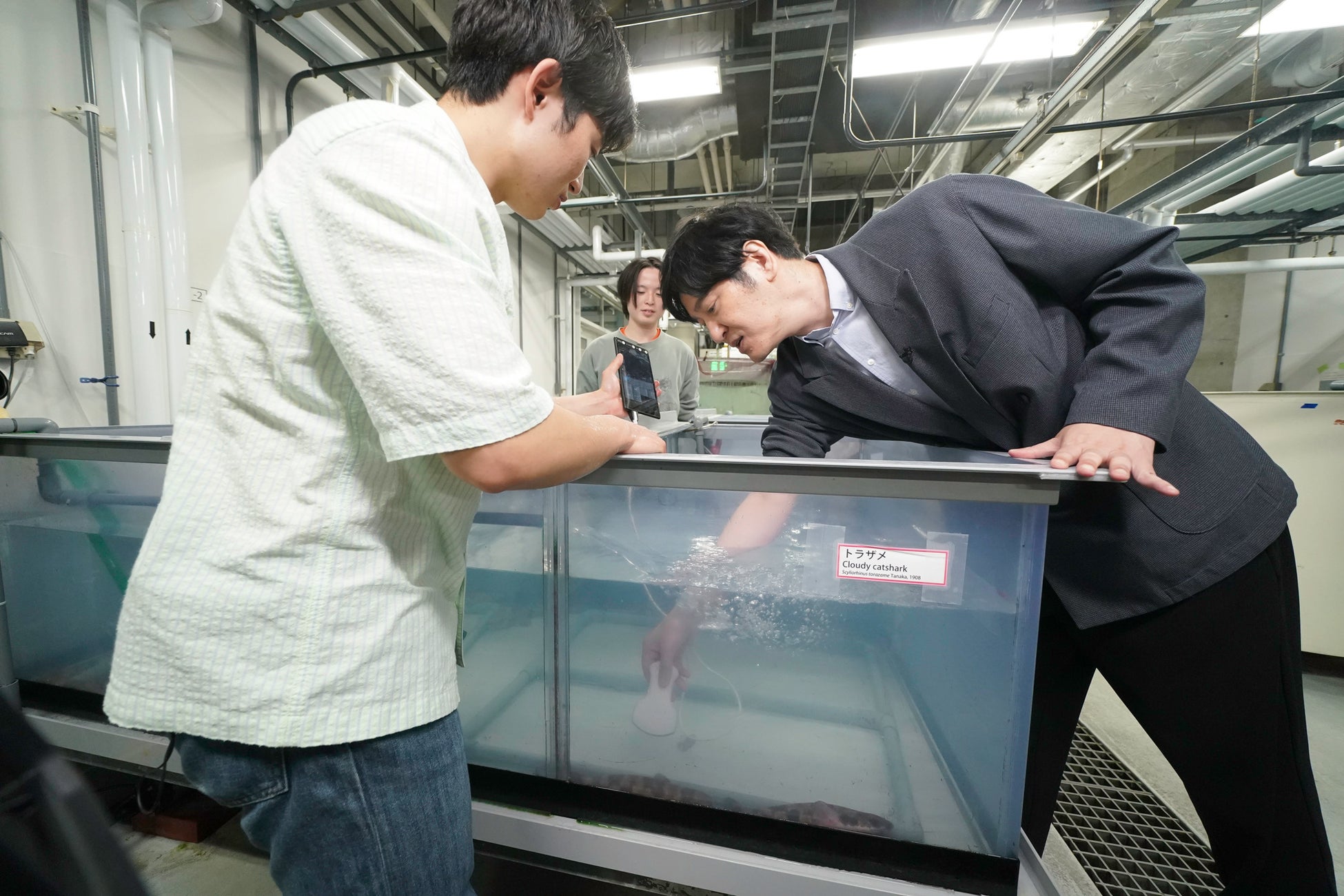 その後は、サメの生態について語り合ったり、飼育実験室でサメのお腹の中をエコー検査でのぞく実験に挑戦したり、研究室の学生と対話したりと、サメ尽くしの時間をとことん楽しんだ田中。