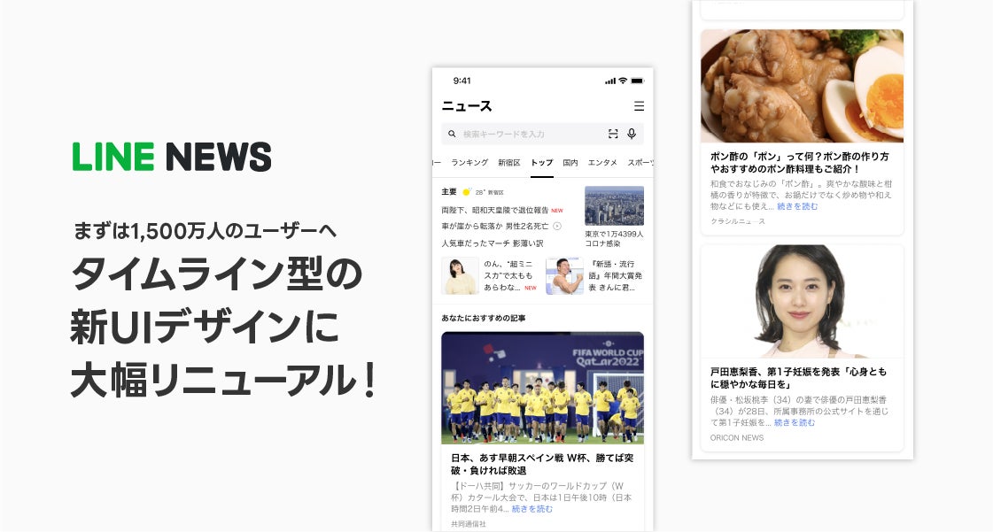 LINE株式会社(本社:東京都新宿区、代表取締役社長:出澤 剛)は、当社が運営するNo.1スマートフォン向けニュースサービス*1「LINE NEWS」にて、LINE NEWSの個人化を今後より強化していく戦略の第一歩として、UIデザインをタイムライン型に大幅リニューアルし、まずはLINE NEWSユーザーの約20%にあたる約1,500万人に向けて本日より提供開始、来春以降の全面移行を目指すことを決定いたしましたのでお知らせいたします。