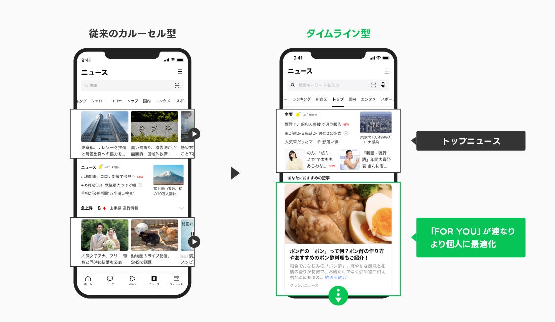 今回導入する新しいUIでは、既存のUIで提供していた「一覧から選んで情報を消費する」という体験から、「タイムライン上でコンテンツをより深く消費する」という体験にシフトさせていくもので、LINE NEWSを「より個人にマッチした情報を、その場で深く取得できる情報プラットフォーム」に変えていくことを目指しております。