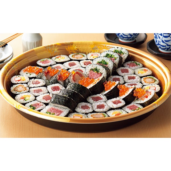 直径36cmのトレーに、「まぐろたたき太巻」「北海道産ほたてを楽しむ海鮮太巻」「こだわり鉄火の中巻」「具材を味わうまぐろたたき中巻」「サラダ中巻」「サーモン中巻」「ヒレカツ中巻」を食べやすくカットして盛りつけ、いくらをトッピングした巻き寿司セットです。いろんな味を少しずつ、家族で楽しみながらお召し上がりいただけます。