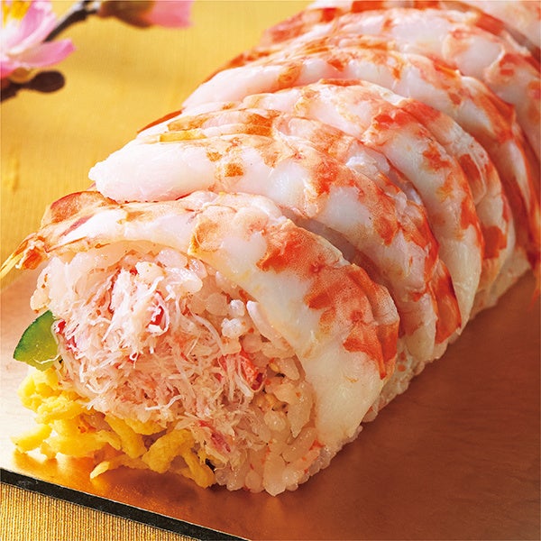 数の子を混ぜ込んだごはんで紅ずわいがにのフレークをたっぷりと巻き上げ、外側には車えびを敷き詰めた贅沢な太巻です。