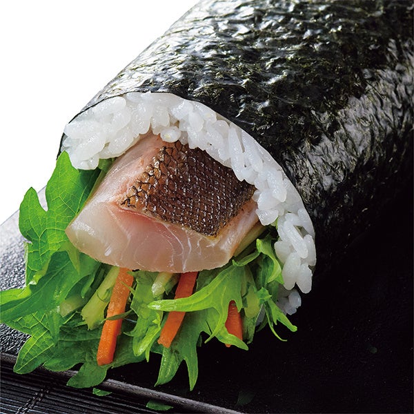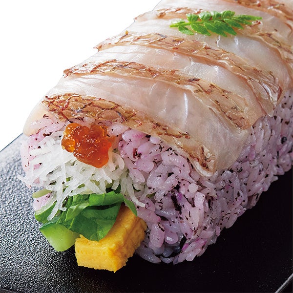漁獲量1位の福岡県筑前海の天然マダイを使用した太巻です。皮目を湯引くことで、引き締まった身の旨味と食感をお楽しみいただけます。