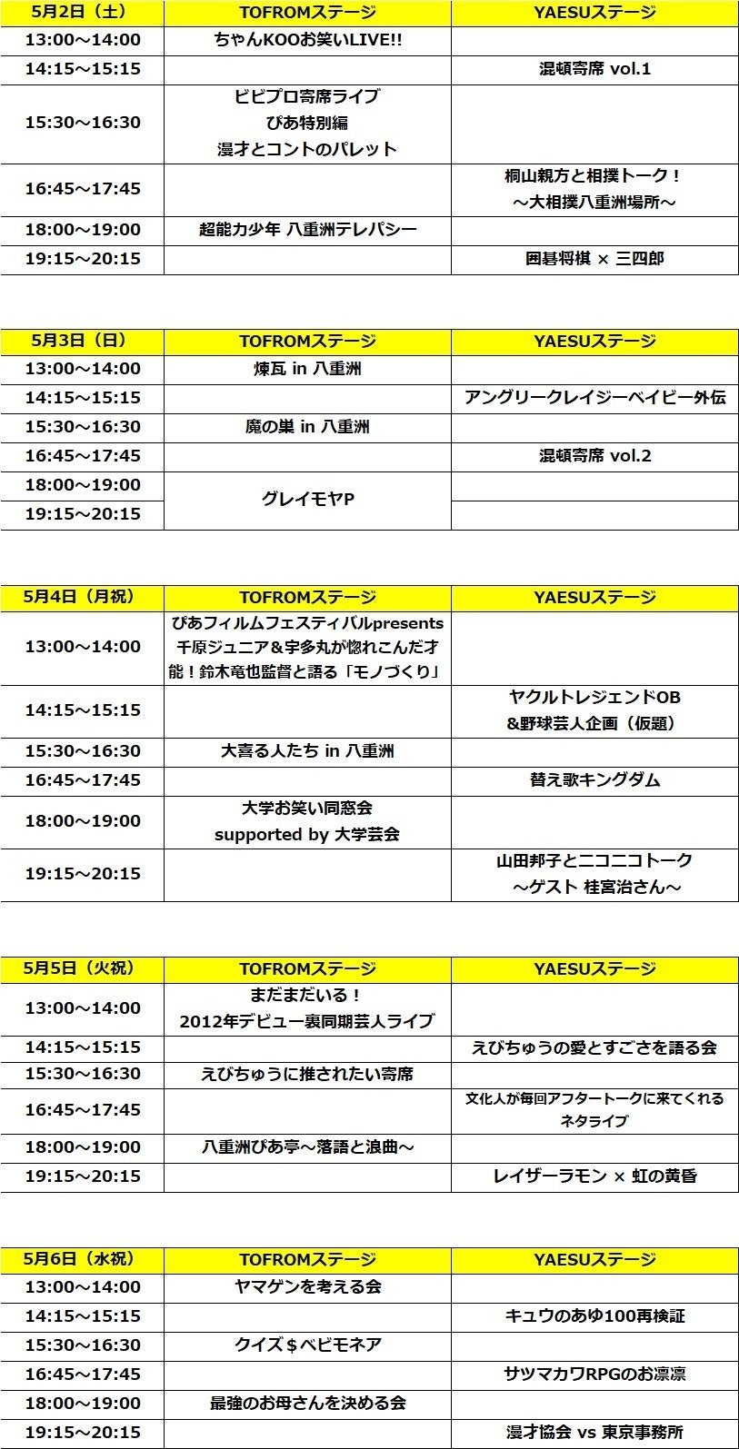 メイン会場は「TOFROM STAGE」「YAESU STAGE」2つのステージ。約200席の会場で、1日5~6ステージの公演を開催いたします。