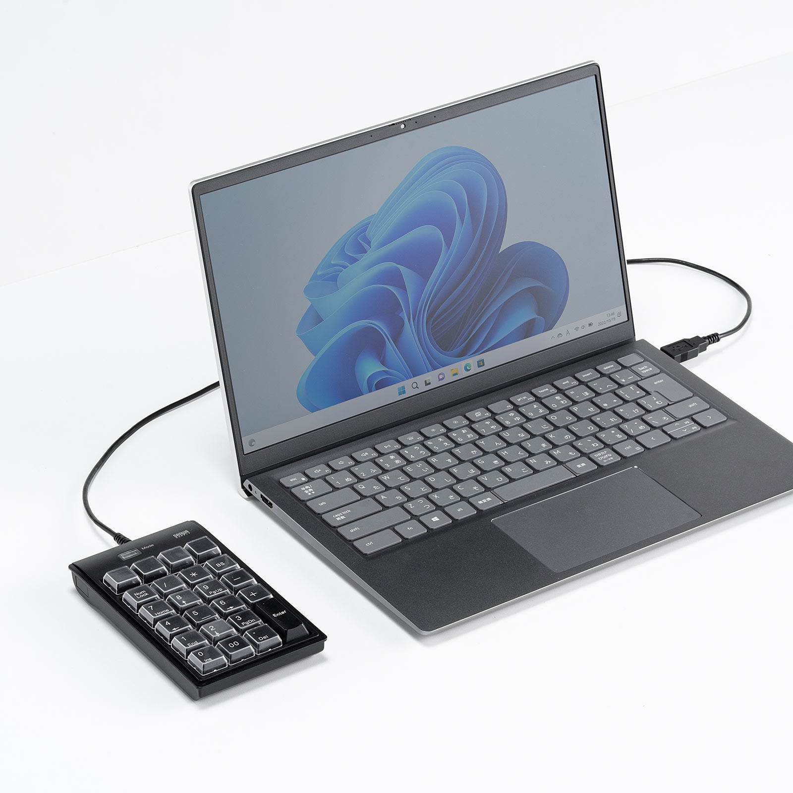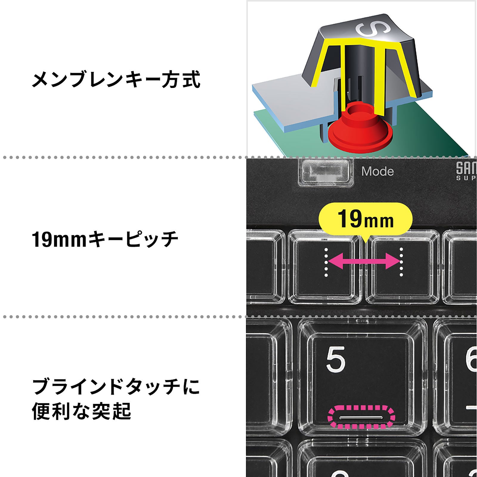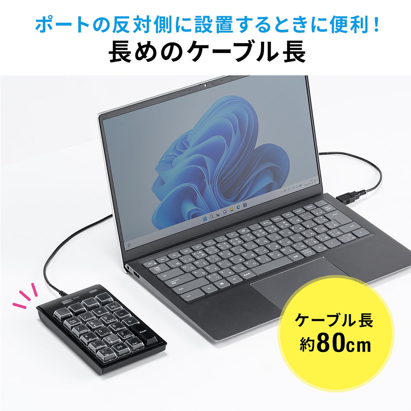 般的なパソコン用キーボードと同じ感覚で入力できるメンブレン方式のキーを搭載しています。ケーブルは長めの80cmです。操作しやすい場所に置いて使えます。