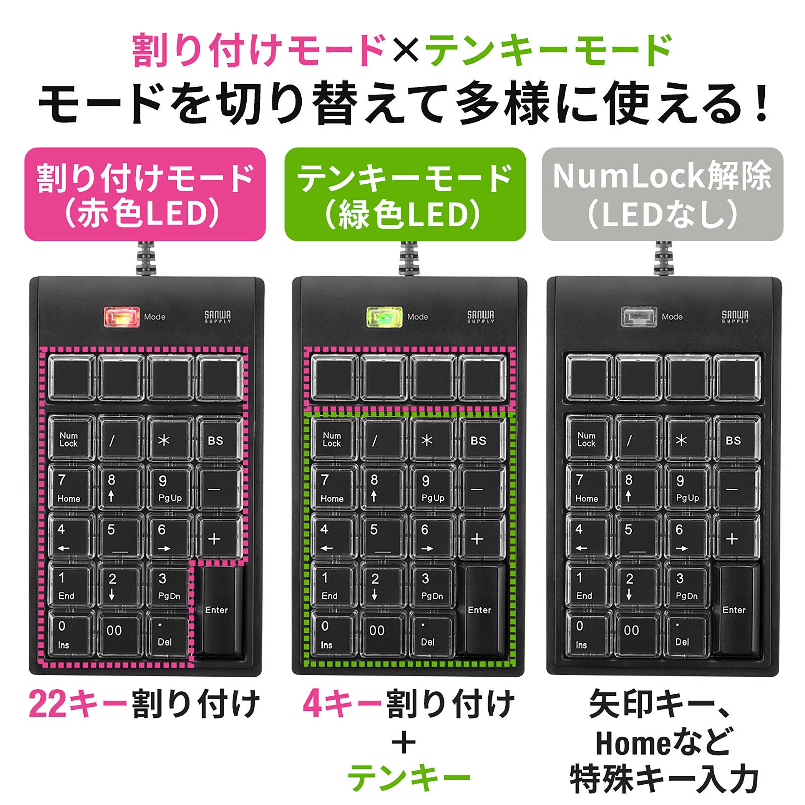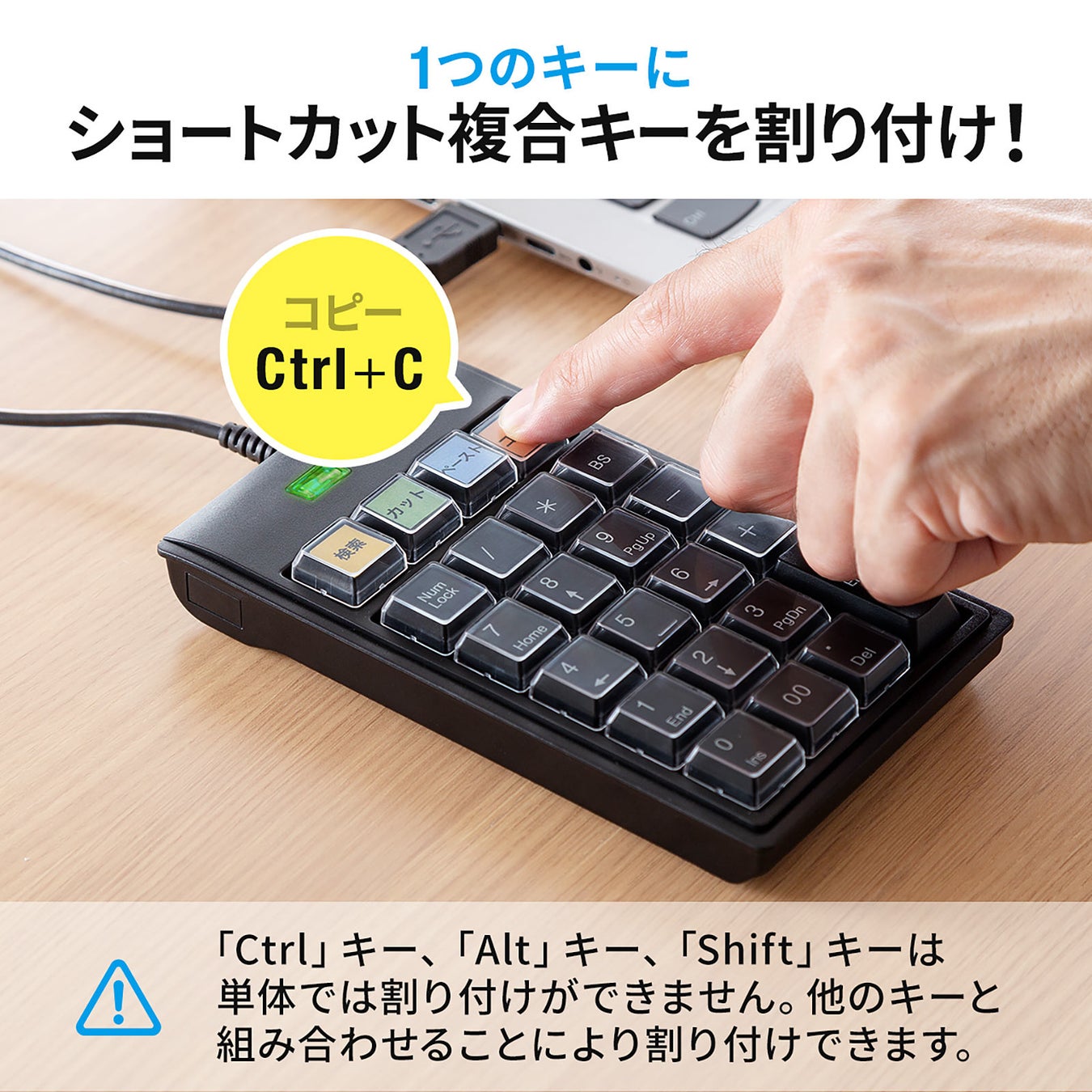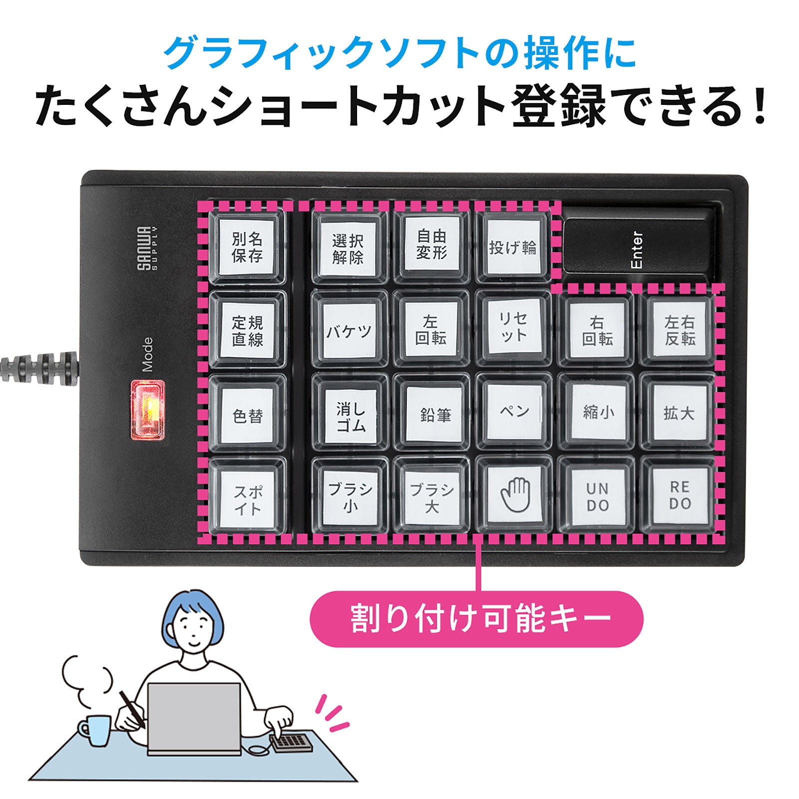 本製品は、よく使うキーボードショートカットや各キーの機能を割り付けできるプログラマブルテンキーです。Enterキー以外の22キーに割り付けできます。