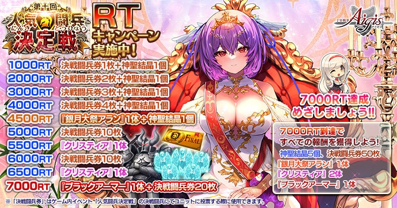 「第十回人気闘兵決定戦」開催中に千年戦争アイギス公式アカウント(@Aigis1000)にて記念ツイートを配信いたします。千年戦争アイギス公式アカウントをフォローし、記念ツイートをリツイートしていただくと、リツイート数に応じて報酬をプレゼントいたします。是非ご参加下さい。