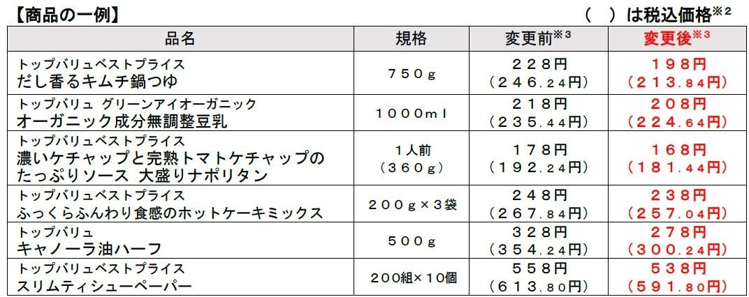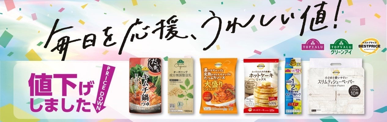 全国約10,000店舗にて、イオンのプライベートブランド「トップバリュ」29品目を値下げします。