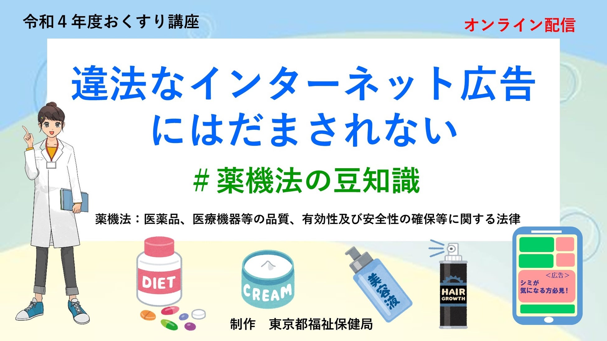 東京都では、「令和4年度 第2回 おくすり講座」をオンライン(WEB配信形式)で開催します。化粧品や健康食品等にかかる違法広告を見極めるポイントについて、動画により分かりやすくご紹介します。ぜひご覧ください。